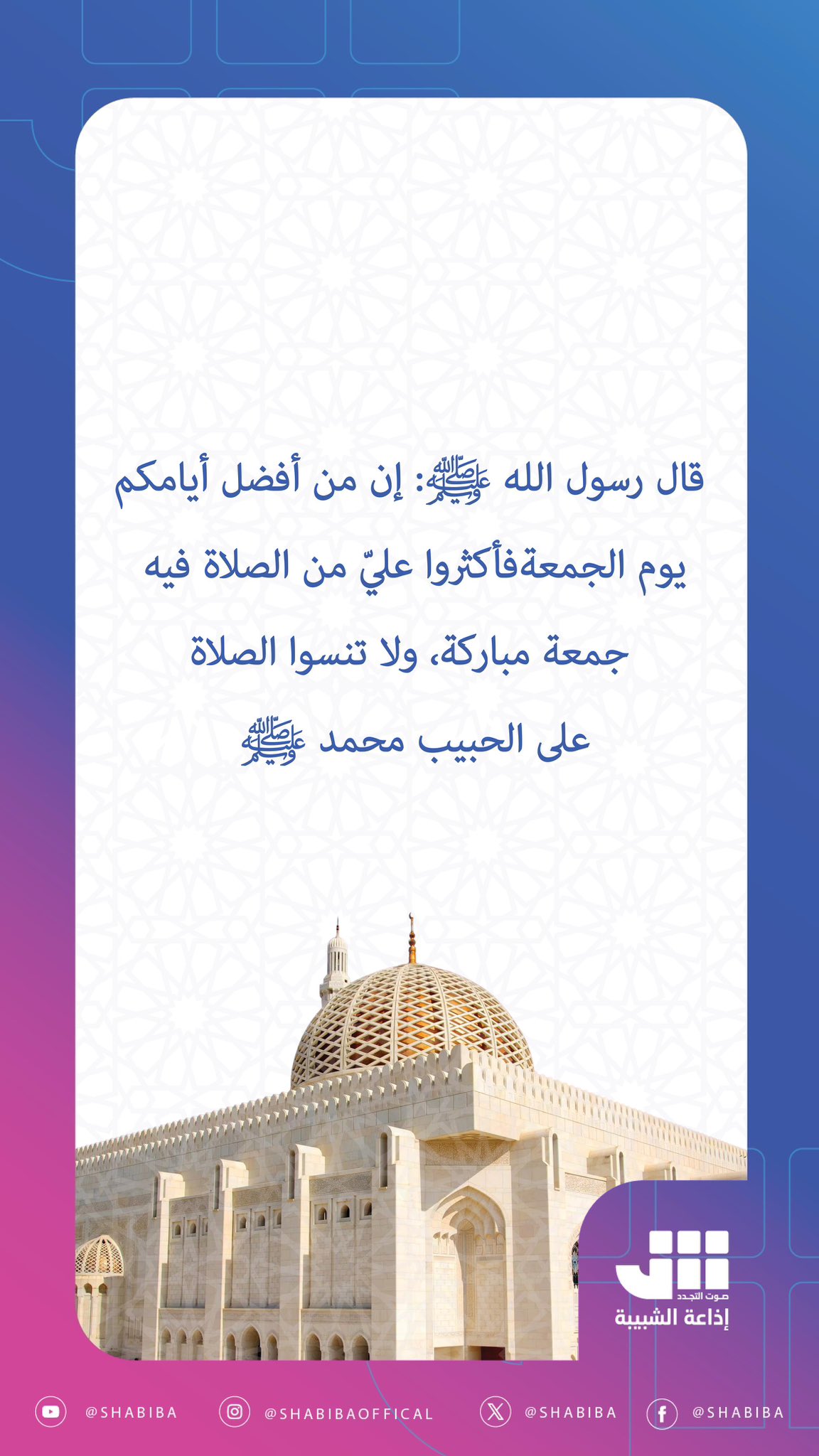 قال رَسُول اللَّهِ : (إن من أفضل أيامكم يوم الجمعة فأكثروا عليّ من الصلاة فيه فإن صلاتكم معروضة علي) ... اللهم صل و سلم و بارك على سيدنا محمد .. جمعة مباركة