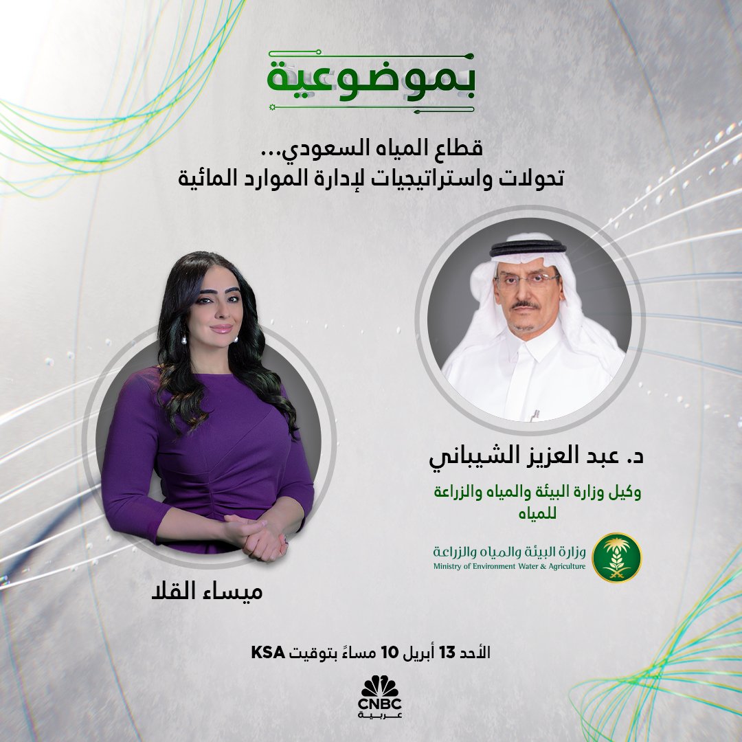 قطاع المياه السعودي.. تحولات واستراتيجيات لإدارة الموارد المائية. حلقة جديدة من بموضوعية مع ميساء القلا وضيفها د. عبد العزيز الشيباني، وكيل وزارة البيئة والمياه والزراعة. الأحد 13 ابريل.. 10 مساءً بتوقيت السعودية