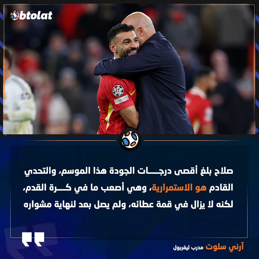 آرني سلوت بعد تجديد عقد صلاح: صلاح بلغ أقصى درجات الجودة هذا الموسم، والتحدي القادم هو الاستمرارية، وهي أصعب ما في كرة القدم، لكنه لا يزال في قمة عطائه، ولم يصل بعد لنهاية مشواره