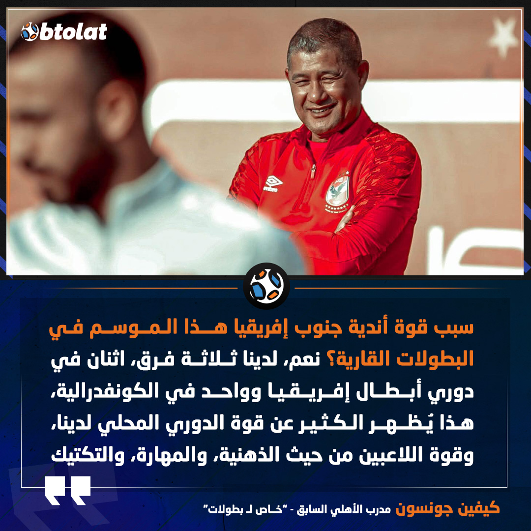 كيفين جونسون "في تصريحات خاصة ل بطولات" عن سبب قوة أندية جنوب إفريقيا هذا الموسم في البطولات القارية. نعم، لدينا ثلاثة فرق، اثنان في دوري أبطال إفريقيا وواحد في الكونفدرالية، هذا يُظهر الكثير عن قوة الدوري المحلي لدينا، وقوة اللاعبين من حيث الذهنية، والمهارة، والتكتيك