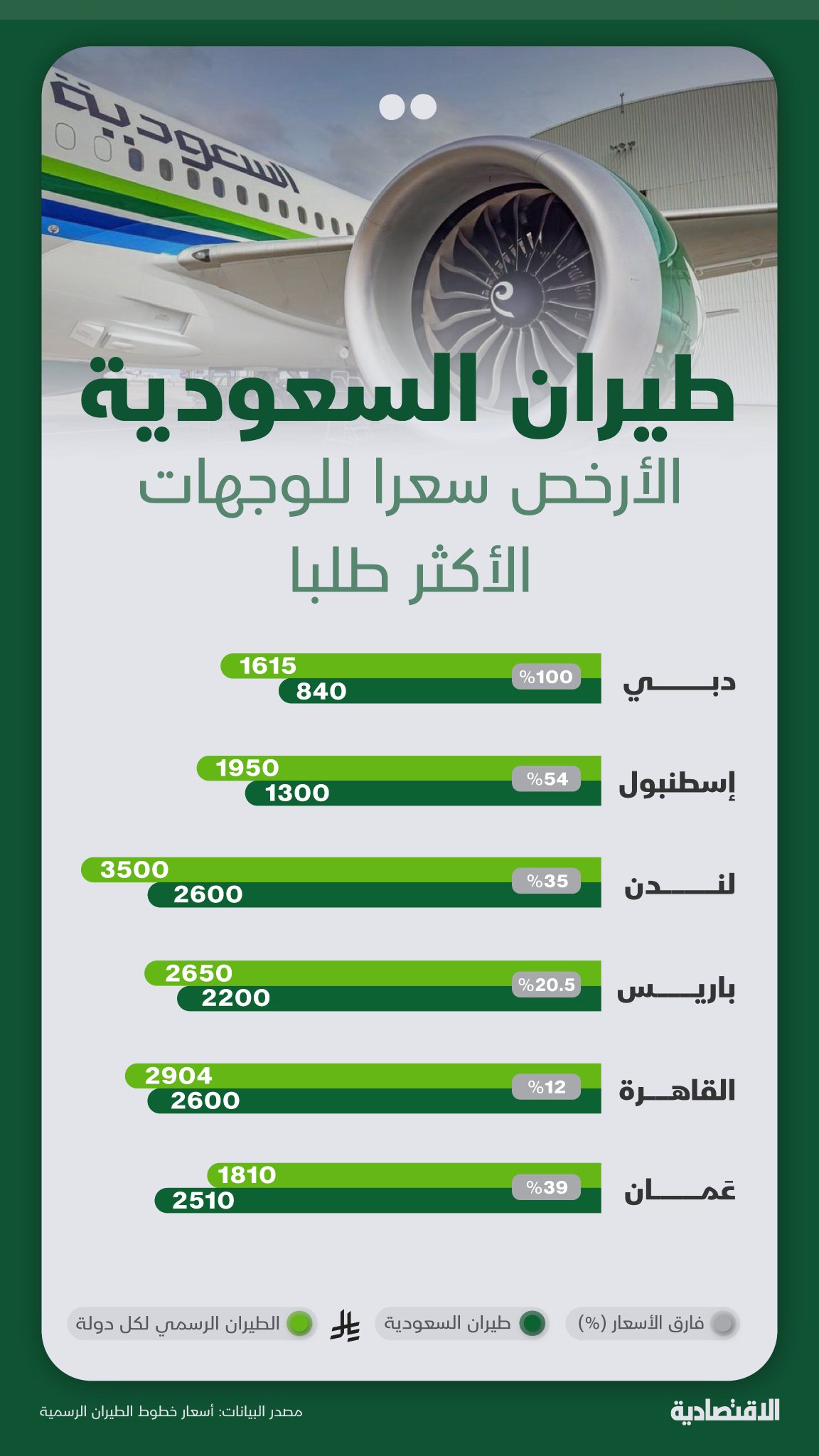 وبحسب وحدة التحليل المالي في "الاقتصادية"، التي استندت إلى بيانات نظام أماديوس العالمي للحجوزات ووكالات السفر، فإن أسعار تذاكر الخطوط السعودية جاءت الأقل سعرا لكل من دبي وأسطنبول ولندن وباريس والقاهرة، مقارنة بأسعار الخطوط الرسمية لدول المدن المذكورة.