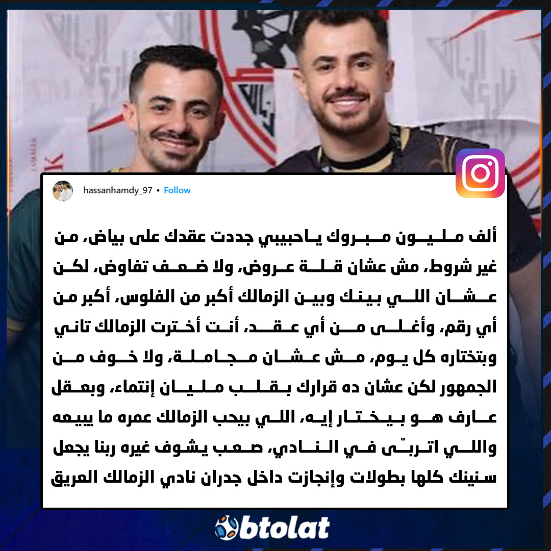 "ألف مليون مبروك ياحبيبي جددت عقدك على بياض، من غير شروط، مش عشان قلة عروض، ولا ضعف تفاوض، لكن عشان اللي بينك وبين الزمالك أكبر من الفلوس". شقيق محمود حمدي الونش عبر حسابه على انستجرام