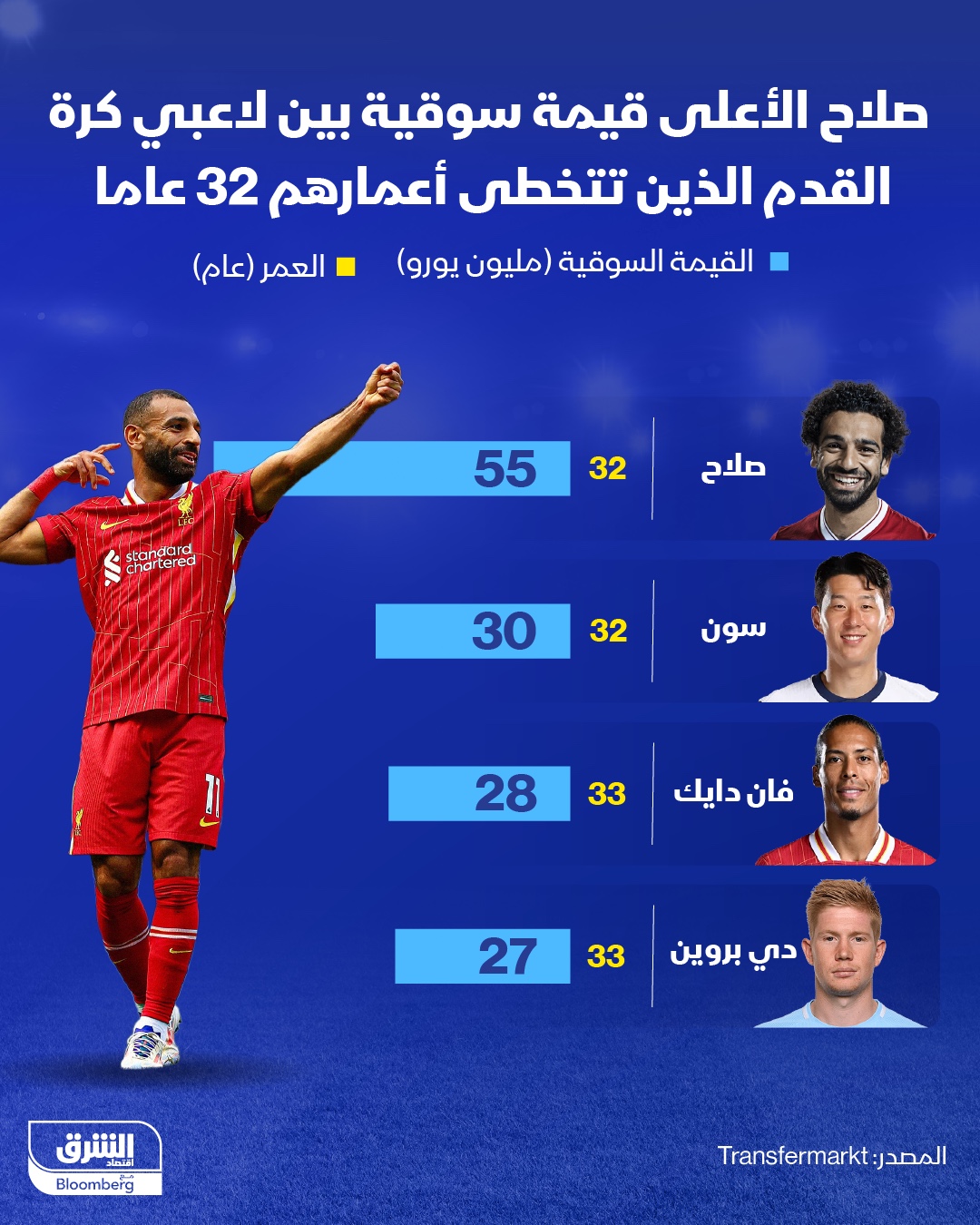 محمد صلاح الذي مدد عقده مع ليفربول الإنجليزي حتى 2027، هو الأعلى قيمة سوقية بين لاعبي كرة القدم الذين تجاوز عمرهم 32 عاما #الشرق_رياضة