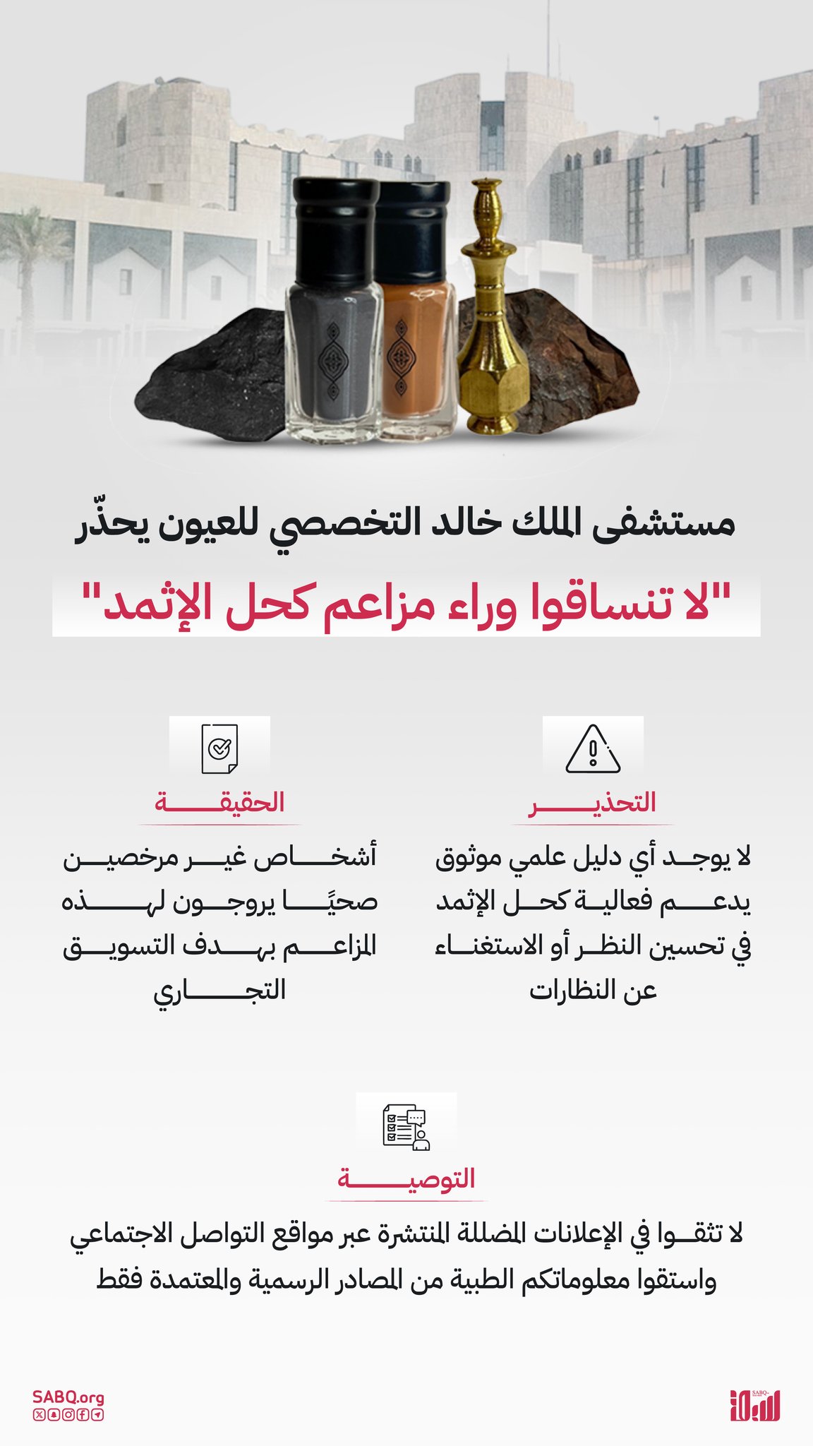 مستشفى الملك خالد تحذّر من الدعاية المضللة التي يروّج لها غير المختصّين بشأن فوائد كحل الإثمد في تحسين النظر أو الاستغناء عن النظارات