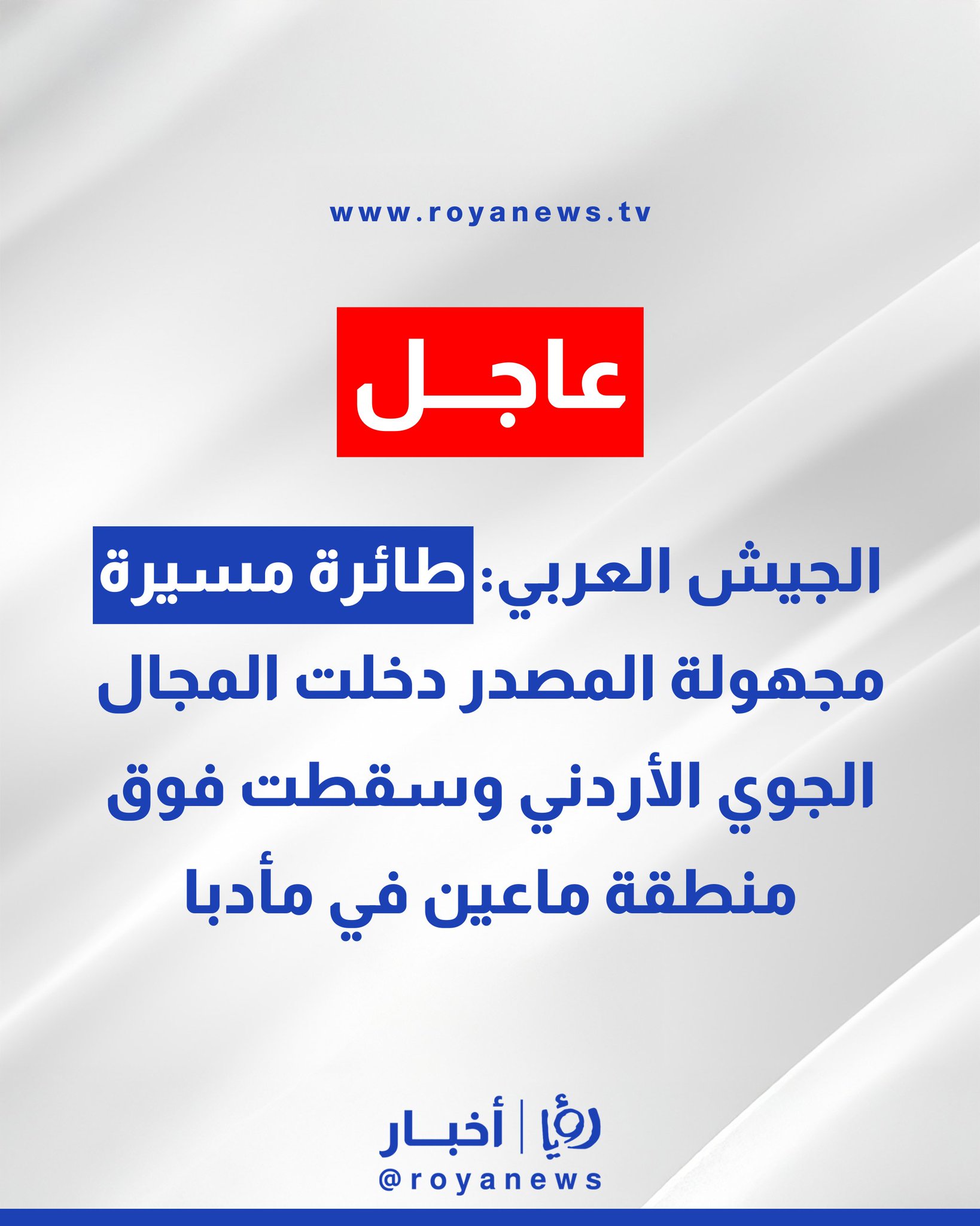 صرح مصدر عسكري مسؤول في القيادة العامة للقوات المسلحة الأردنية ــ الجيش العربي، أن طائرة مسيرة مجهولة المصدر دخلت المجال الجوي الأردني وسقطت فوق منطقة ماعين في محافظة مأدبا.