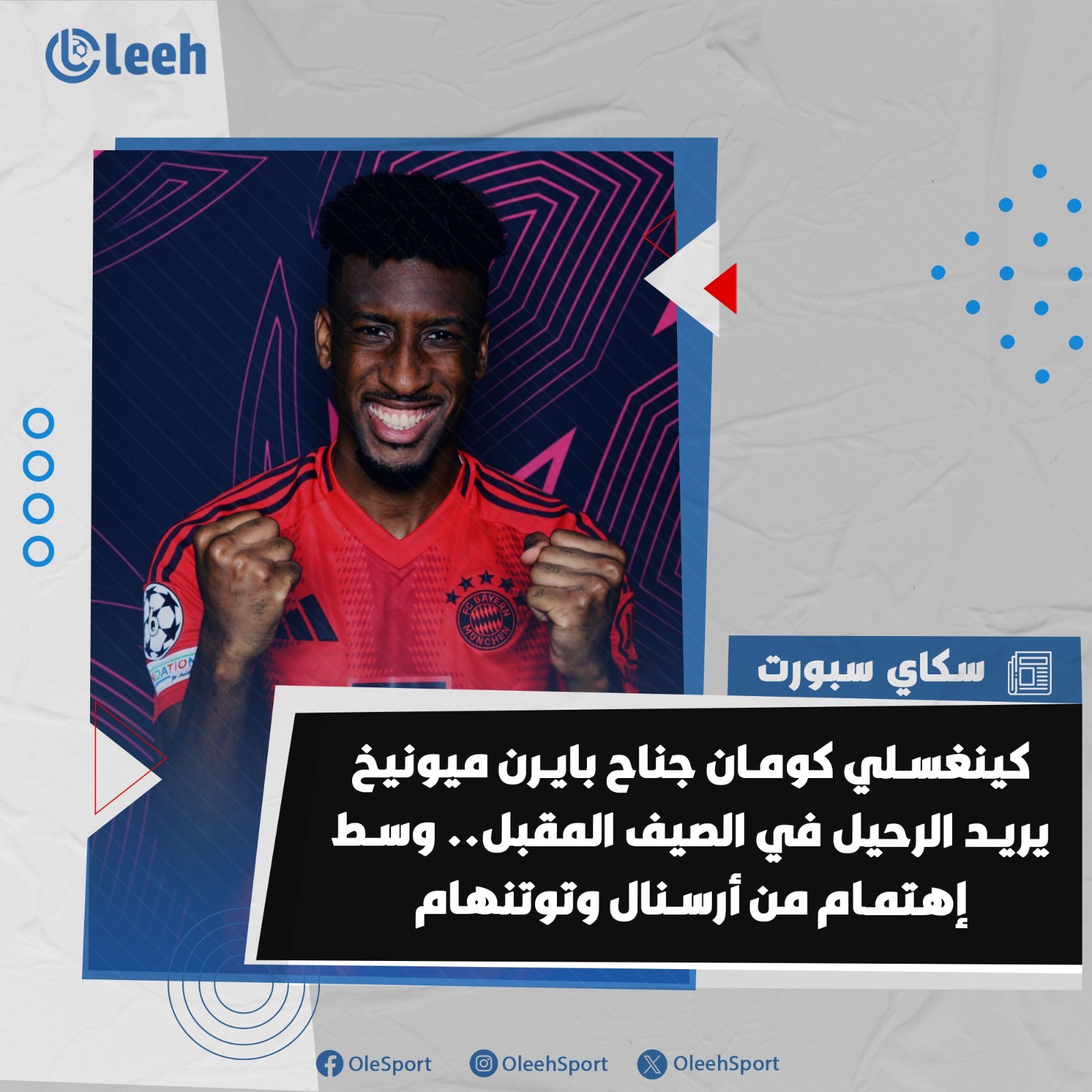 سكاي سبورت | كينغسلي كومان يخطط لمغادرة بايرن ميونيخ في الصيف المُقبل وسط إهتمام من أرسنال وتوتنهام.. يُعد أرسنال هو الخيار الأكثر واقعية للجناح الفرنسي.. توتنهام يرغب في التحرك من أجل كومان، لكن راتبه المُرتفع يمثل عائق