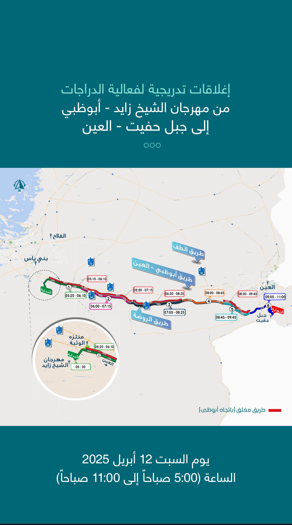 أبوظبي للتنقل: إغلاقات تدريجية لفعالية الدراجات من مهرجان الشيخ زايد في أبوظبي إلى جبل حفيت في العين غداً السبت