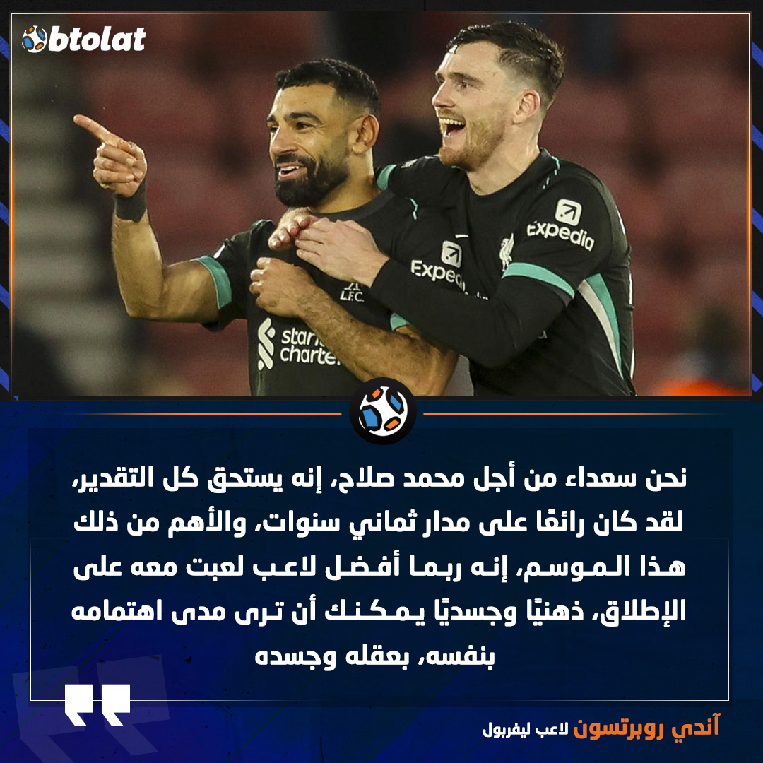آندي روبرتسون: نحن سعداء من أجل محمد صلاح، إنه يستحق كل التقدير، لقد كان رائعًا على مدار ثماني سنوات، والأهم من ذلك هذا الموسم، إنه ربما أفضل لاعب لعبت معه على الإطلاق، ذهنيًا وجسديًا يمكنك أن ترى مدى اهتمامه بنفسه، بعقله وجسده