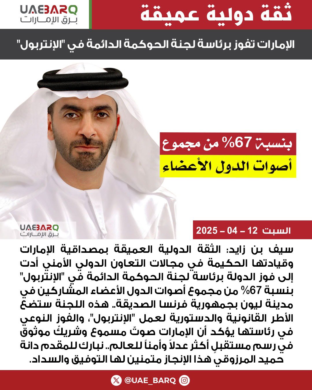 الإمارات تفوز برئاسة لجنة الحوكمة الدائمة في #"الإنتربول".