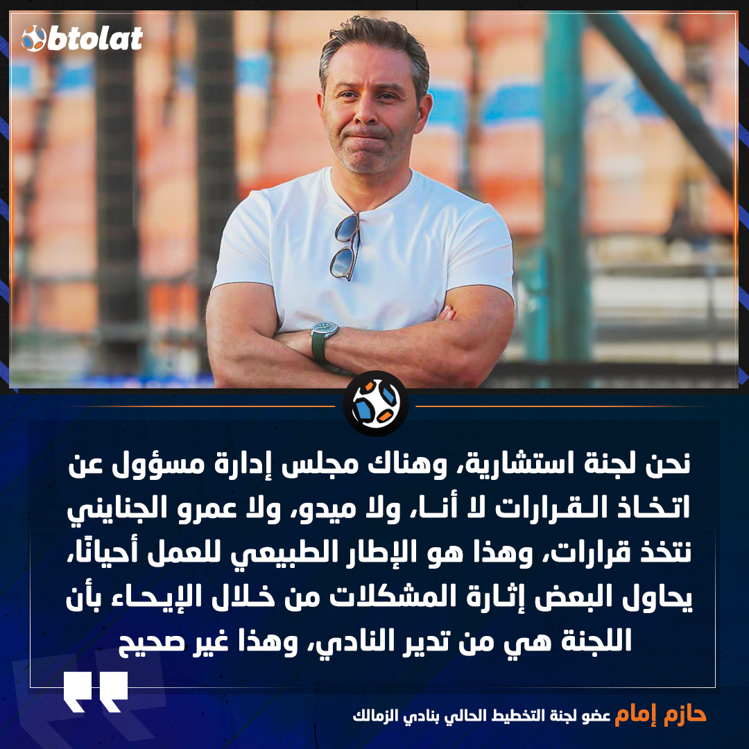 حازم إمام: نحن لجنة استشارية، وهناك مجلس إدارة مسؤول عن اتخاذ القرارات لا أنا، ولا ميدو، ولا عمرو الجنايني نتخذ قرارات، وهذا هو الإطار الطبيعي للعمل أحيانًا، يحاول البعض إثارة المشكلات من خلال الإيحاء بأن اللجنة هي من تدير النادي، وهذا غير صحيح