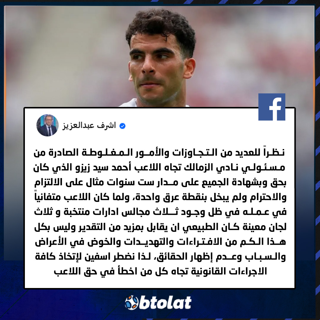 المحامي أشرف عبد العزيز يعلن إتخاذ كافة الاجراءات القانونية تجاه مسؤلي نادي الزمالك وكل من اخطأ في حق أحمد سيد زيزو