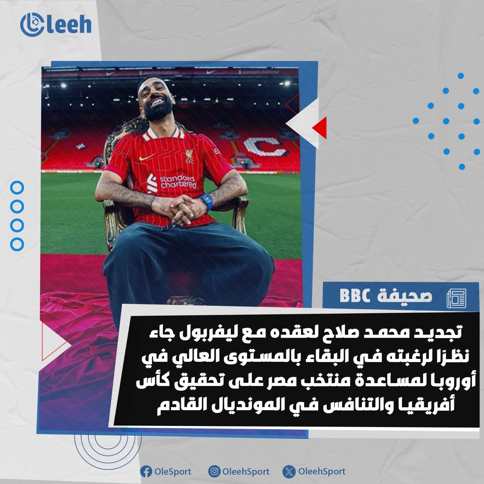 بي بي سي | محمد صلاح جدد عقده مع ليفربول من أجل البقاء في المستوى العالي في أوروبا لأطول وقت ممكن ومساعدة منتخب مصر في التتويج بكأس افريقيا والتنافس في المونديال المُقبل