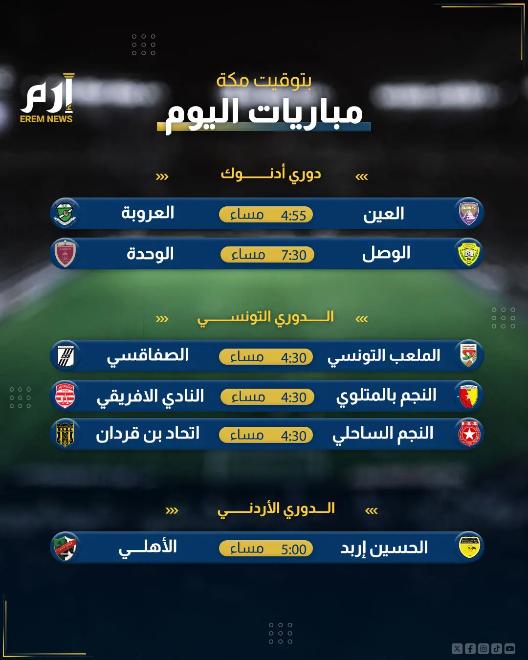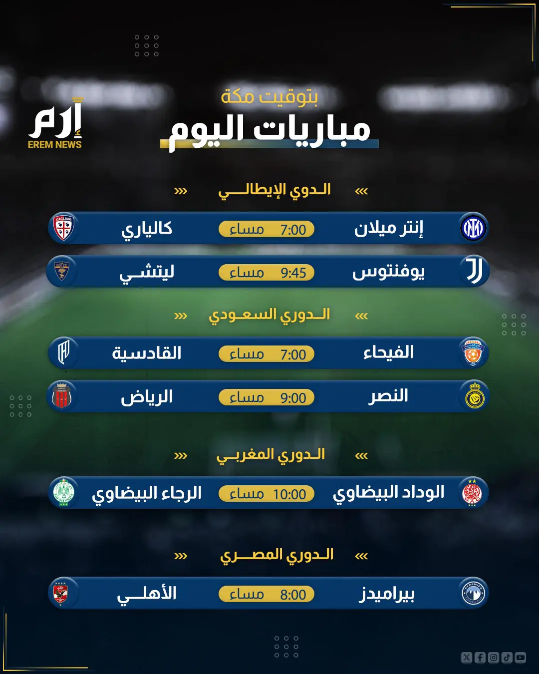 وفي الدوري السعودي يسعى النصر، بقيادة نجمه كريستيانو رونالدو للفوز على الرياض ليصبح على بعد نقطة واحدة من الهلال ثاني الترتيب، بينما سيلعب القادسية في ضيافة الفيحاء.