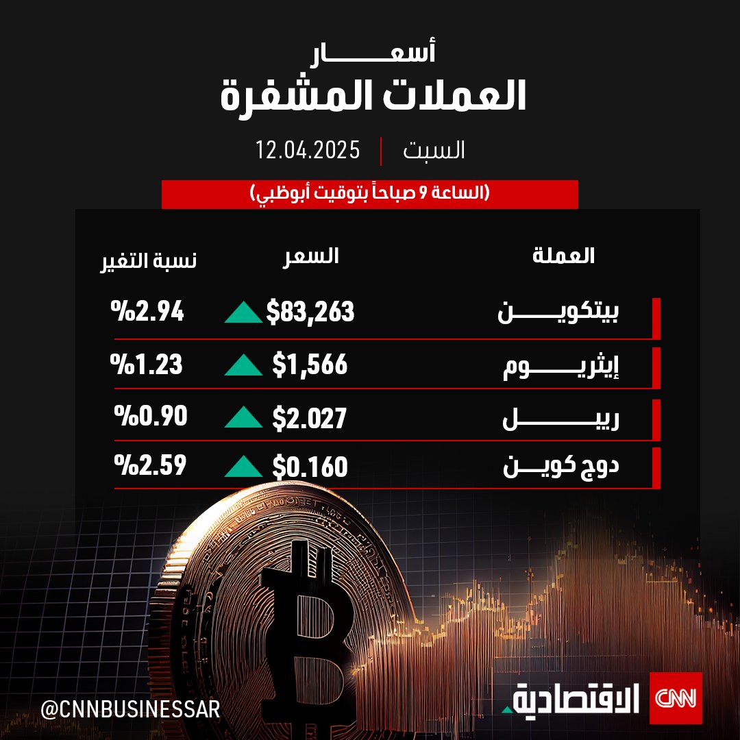 أسعار أبرز العملات المشفرة ليوم السبت 12 أبريل 2025، بيتكوين عند مستوى 83 ألف دولار، وارتفاع ريبل وإيثريوم ودوج كوين. #العالم_بلغة_الأعمال