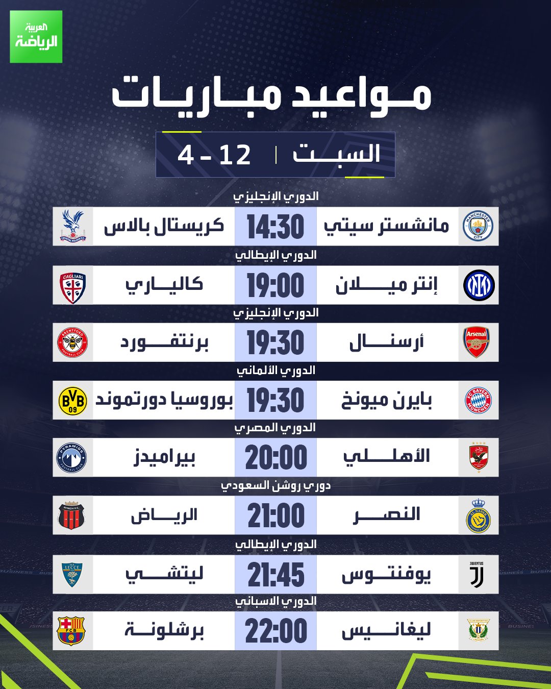مباريات السبت. مانشستر سيتي يواجه كريستال بالاس في افتتاح الجولة 32 من الدوري الإنجليزي. دير كلاسيكر بين بايرن ميونخ ودورتموند في الدوري الألماني. مواجهة قوية بين الأهلي وبيراميدز والنصر يستضيف الرياض. برشلونة يحل ضيفاً على ليغانيس في الليغا