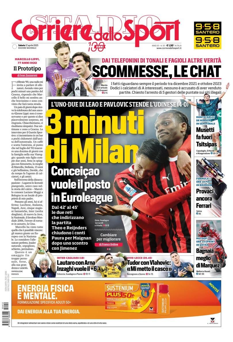 غلاف صحيفة كورييري ديلا سيرا الإيطالية.. 3 دقائق من ميلان: هدفان من لياو وبافلوفيتش لاعبي الروسونيري يسقطان أودينيزي بنتيجة (4-0) في المباراة التي جمعت الفريقين آمس في الدوري الإيطالي.. 12 لاعبًا من الدوري الإيطالي متهمون بإدارة رهانات على المباريات.. إنتر ميلان يصطدم بكالياري اليوم في السيريا.. CorSport