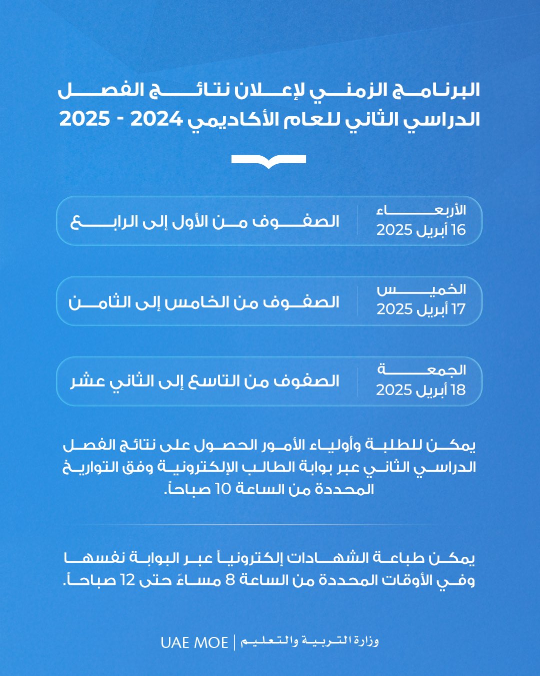 وزارة التربية والتعليم تعلن عن البرنامج الزمني لإعلان نتائج الفصل الدراسي الثاني للعام الأكاديمي 2024 - 2025.. (وزارة التربية والتعليم في الإمارات العربية المتحدة) #الشارقة24