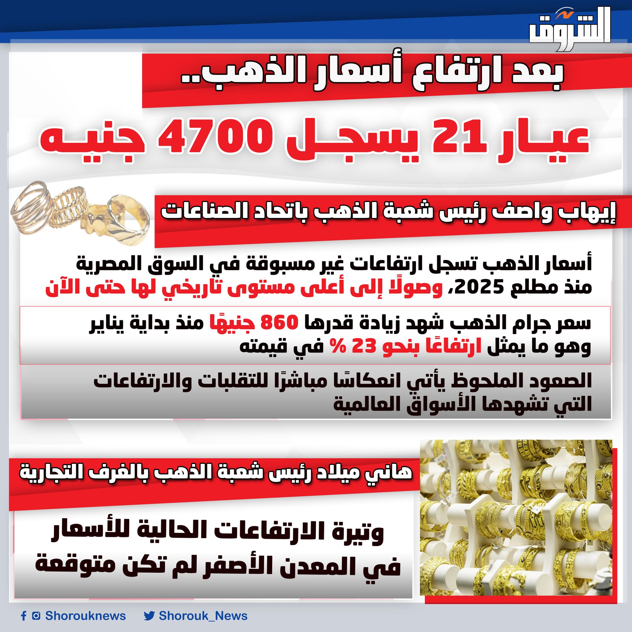بعد ارتفاع أسعار الذهب.. عيار 21 يسجل 4700 جنيه