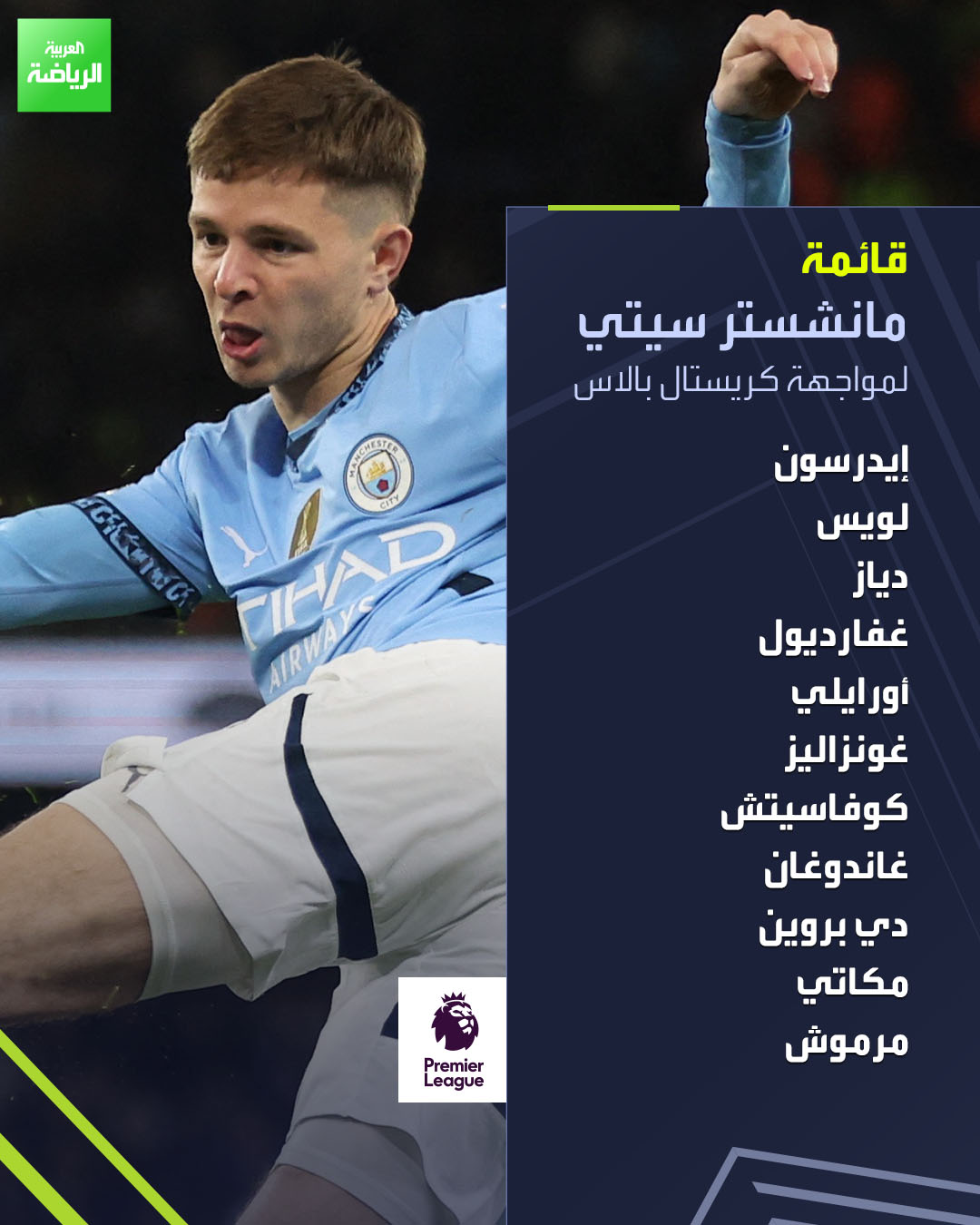 مكاتي يبدأ أساسيًا مع مانشستر سيتي أمام كريستال بالاس في الدوري الإنجليزي _رياضة