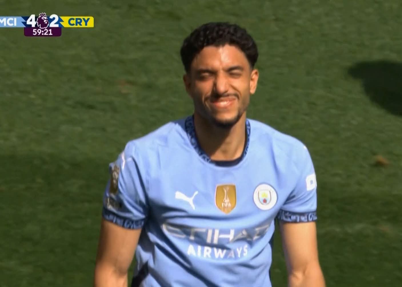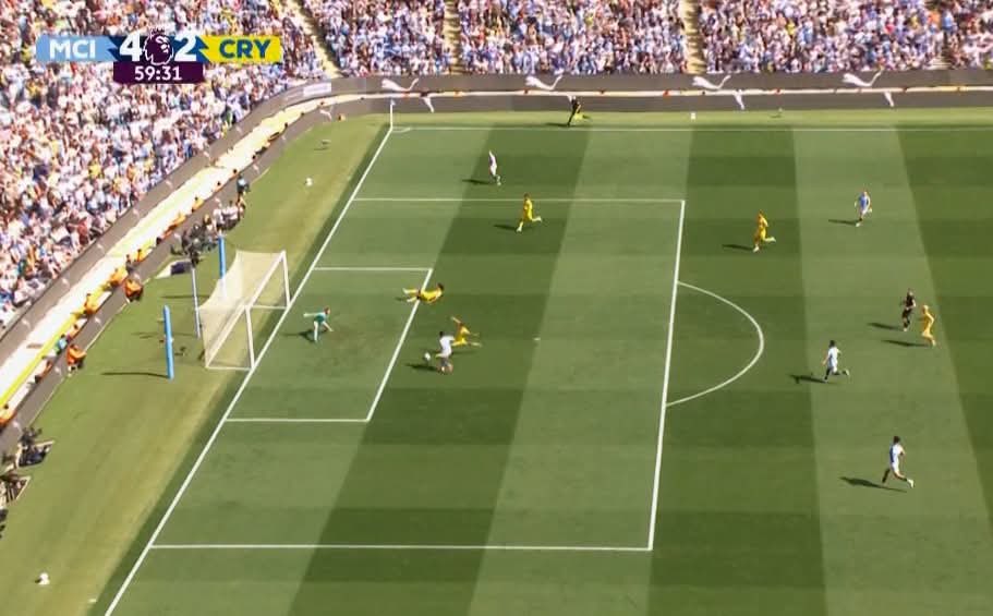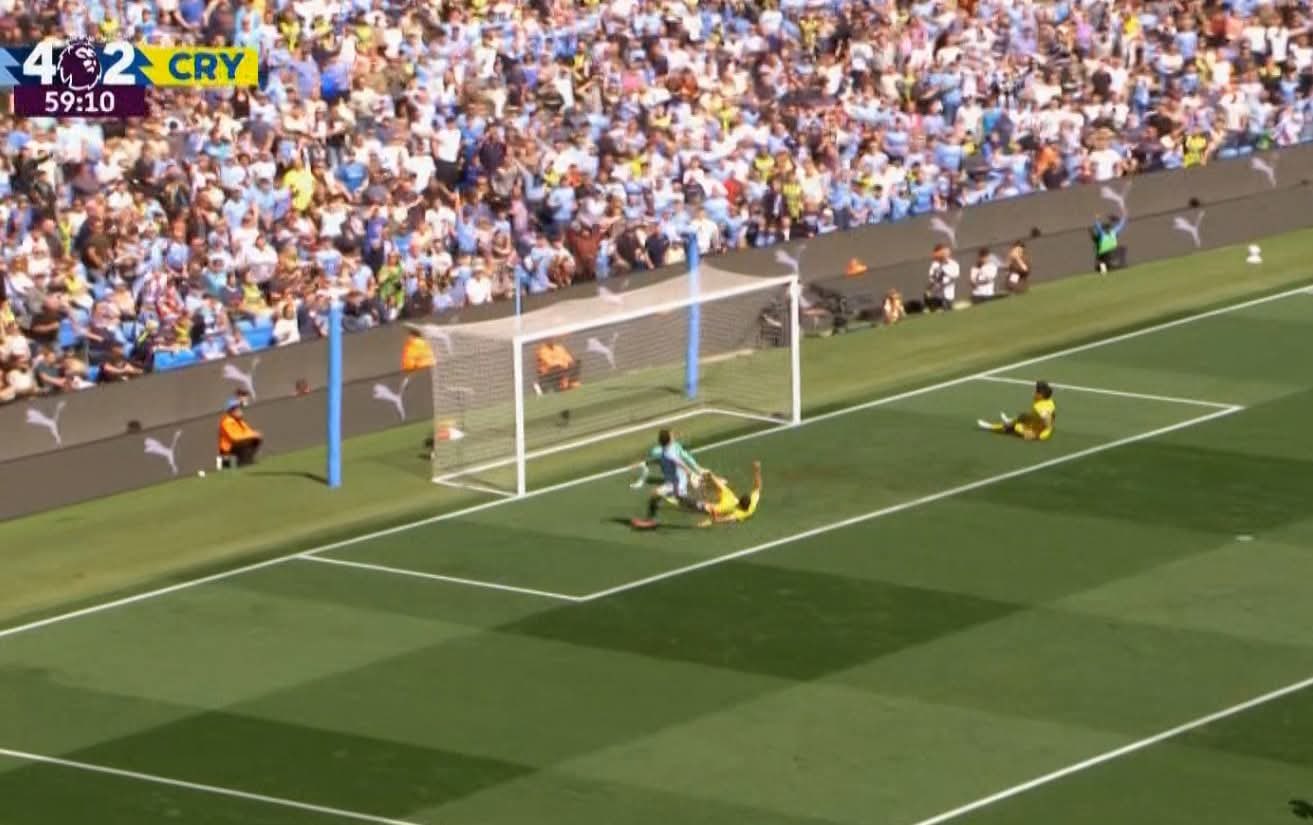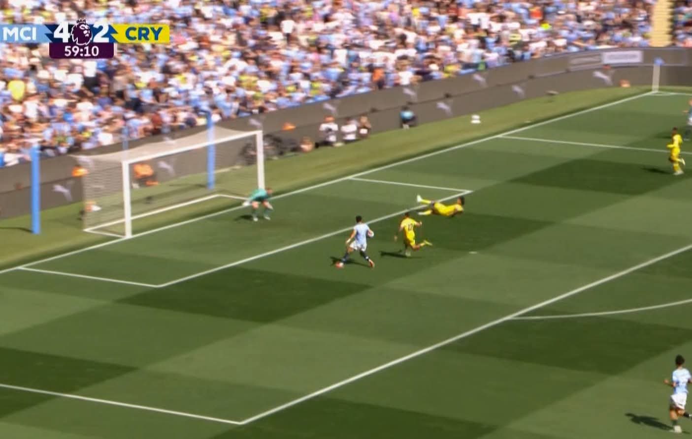 عمر مرموش يهدر فرصة الهدف الخامس ل مانشستر سيتي والثاني له في المباراة أمام مرمى كريستال بالاس مباشرةً