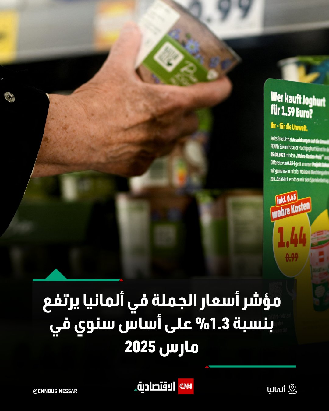 مؤشر أسعار الجملة في ألمانيا يرتفع بنسبة 1.3% على أساس سنوي في مارس 2025. أظهرت بيانات رسمية صادرة اليوم الثلاثاء أن أسعار الجملة في ألمانيا ارتفعت بنسبة 1.3% في مارس مقارنةً بالشهر نفسه من العام الماضي.. وعلى أساس شهري، تراجعت أسعار الجملة بنسبة 0.2% وفقاً لما أعلنه مكتب الإحصاء الفيدرالي. #العالم_بلغة_الأعمال