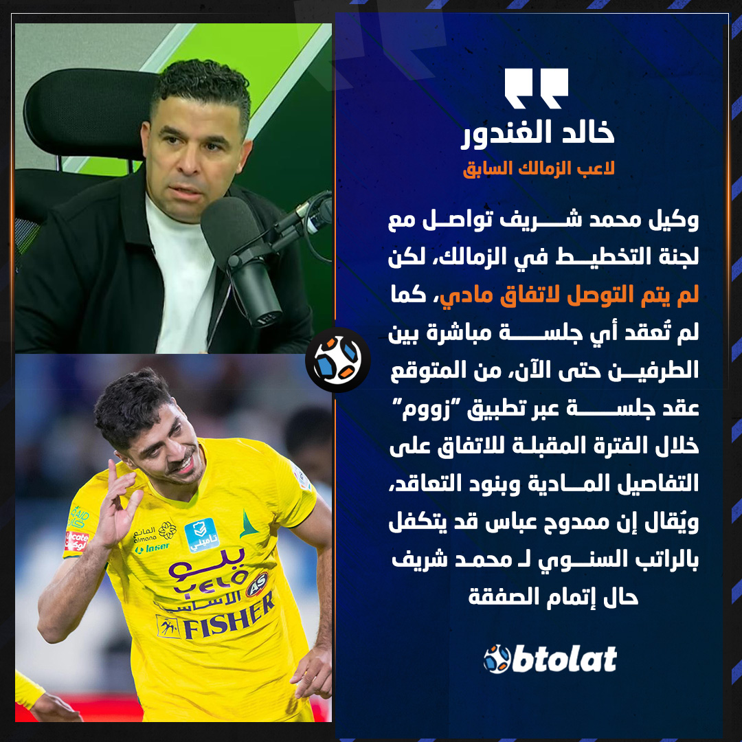 خالد الغندور: لكن لم يتم التوصل لاتفاق مادي بين الزمالك ومحمد شريف، ويُقال إن ممدوح عباس قد يتكفل بالراتب السنوي ل محمد شريف حال إتمام الصفقة