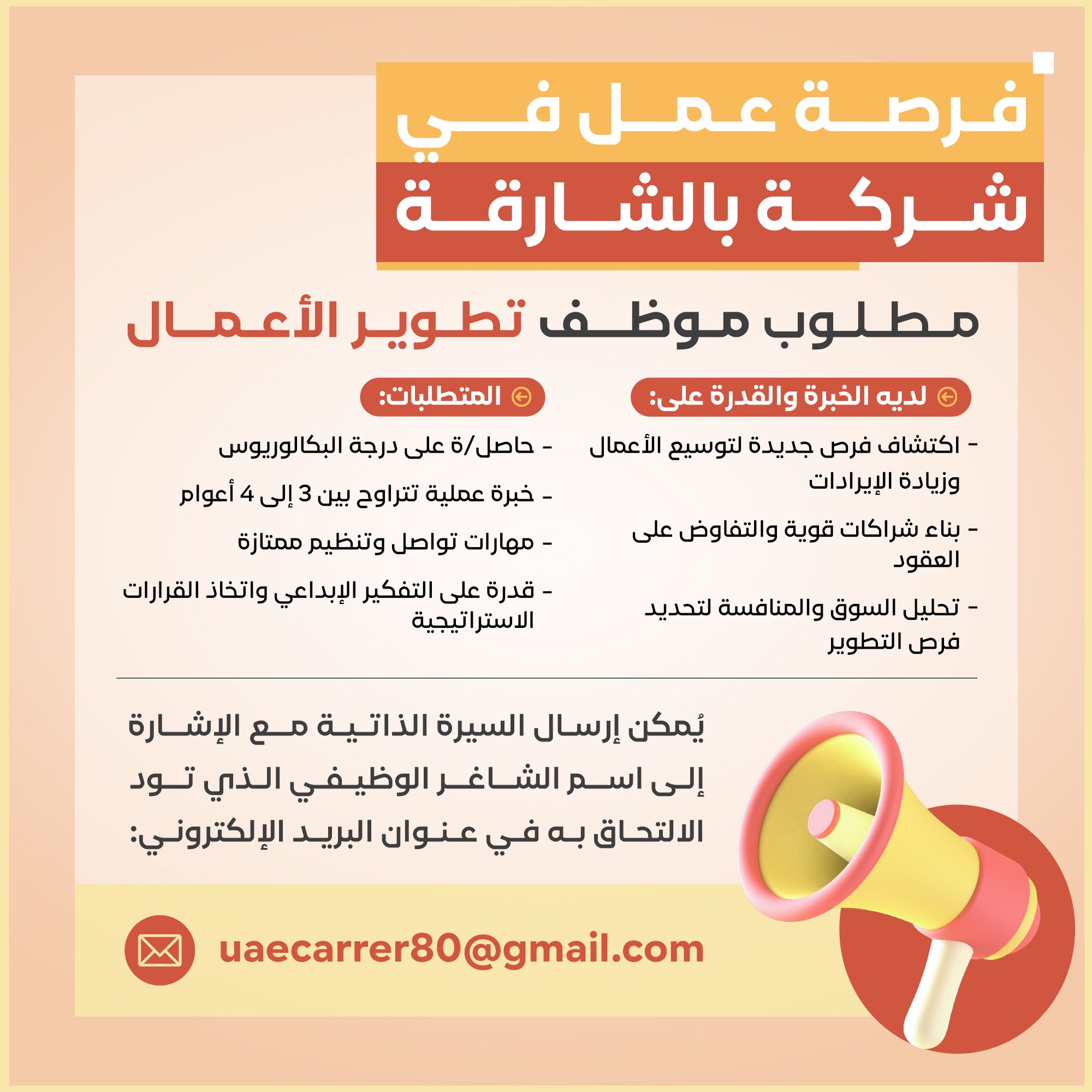 مطلوب موظف تطوير الأعمال لشركة في الشارقة حسب التفاصيل الموضّحة، وللتقديم يُمكن إرسال السيرة الذاتية مع الإشارة إلى اسم الشاغر الوظيفي عبر البريد الإلكتروني: uaecarrer80gmail.com