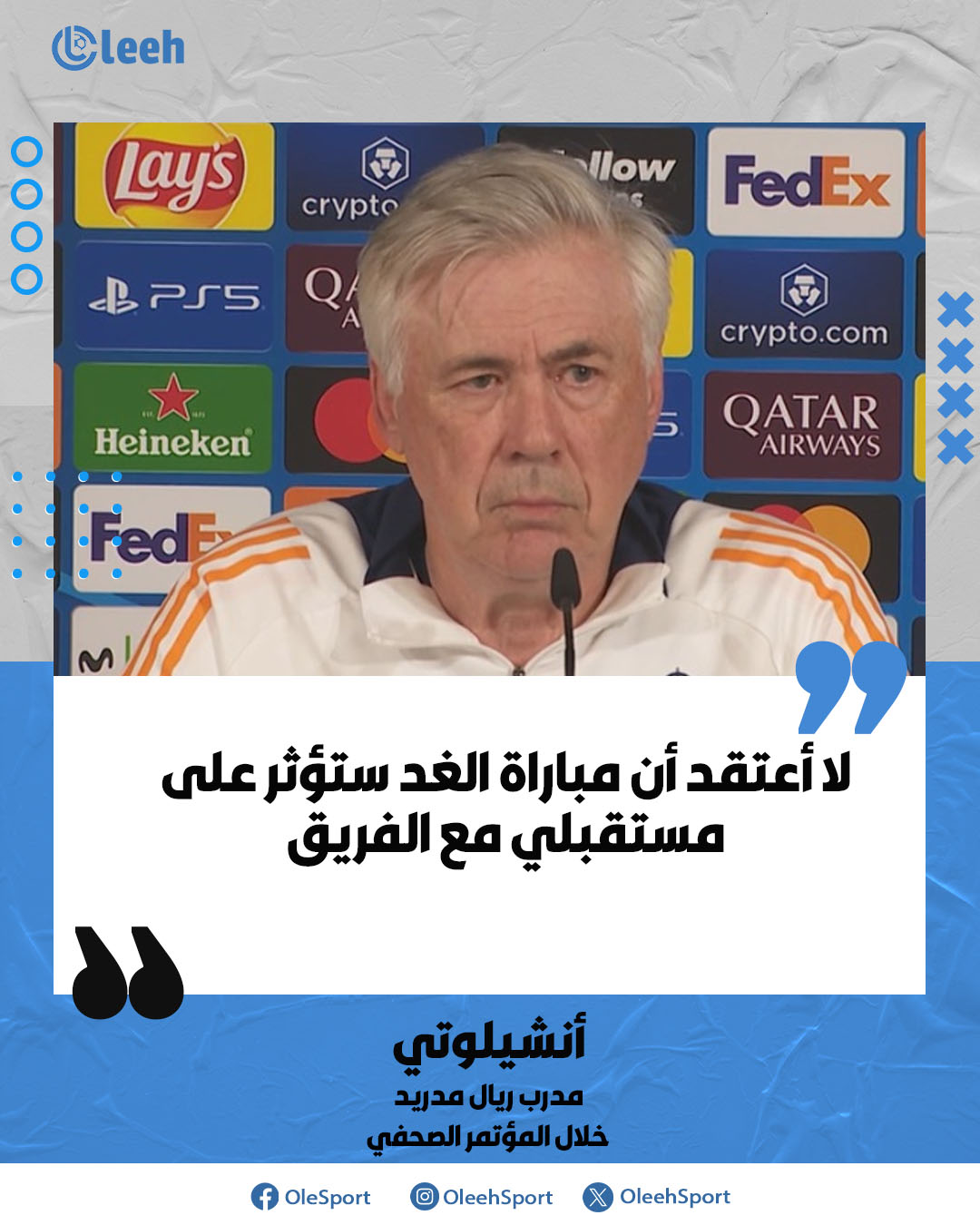 أنشيلوتي خلال المؤتمر الصحفي: "لا أعتقد أن مباراة الغد ستؤثر على مستقبلي مع الفريق"
