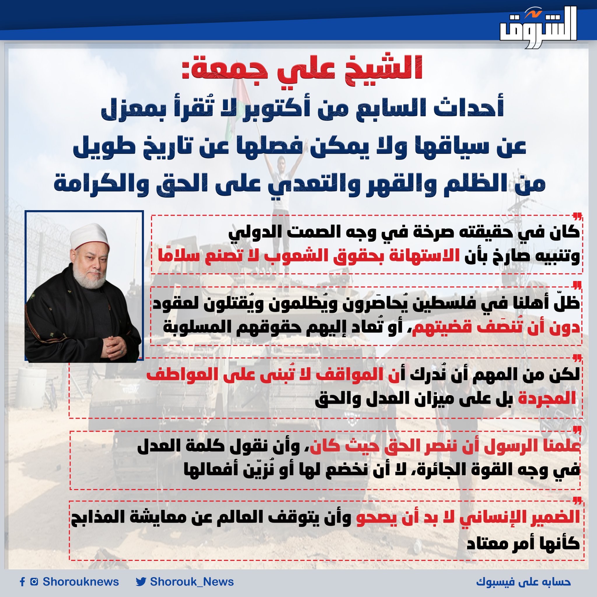 الشيخ علي جمعة: أحداث السابع من أكتوبر لا تُقرأ بمعزل عن سياقها ولا يمكن فصلها عن تاريخ طويل من الظلم والقهر والتعدي على الحق والكرامة