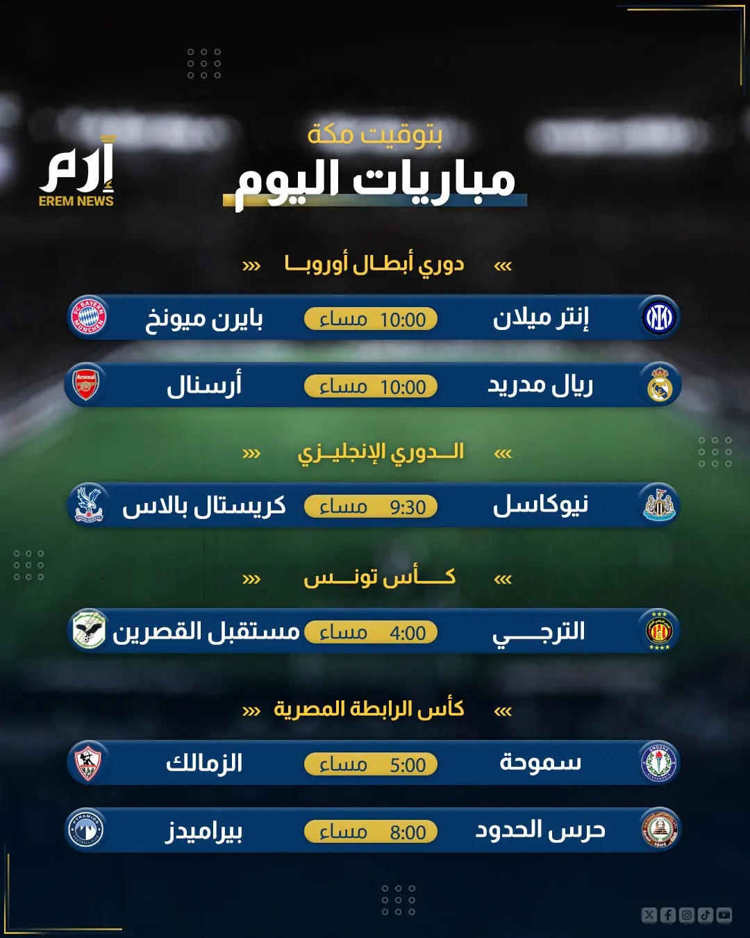 مواجهة نارية لريال مدريد ضد آرسنال وإنتر ميلان يستضيف بايرن ميونخ في دوري أبطال أوروبا. إليكم مواعيد أبرز مباريات اليوم