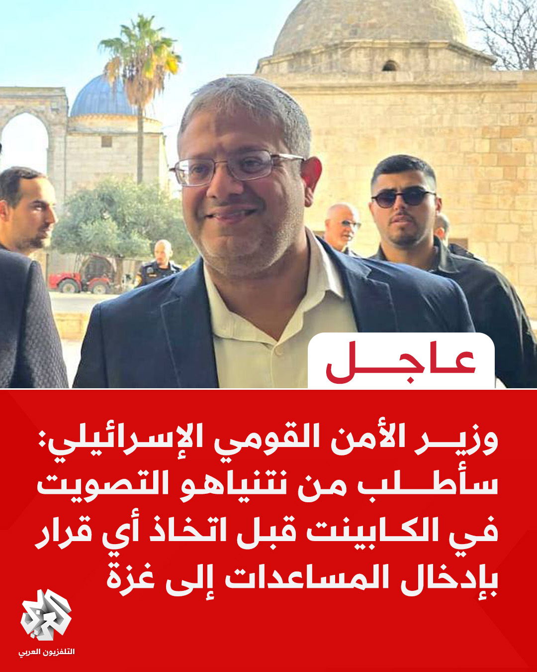 عاجل | وزير الأمن القومي الإسرائيلي: سأطلب من نتنياهو التصويت في الكابينت قبل اتخاذ أي قرار بإدخال المساعدات إلى غزة
