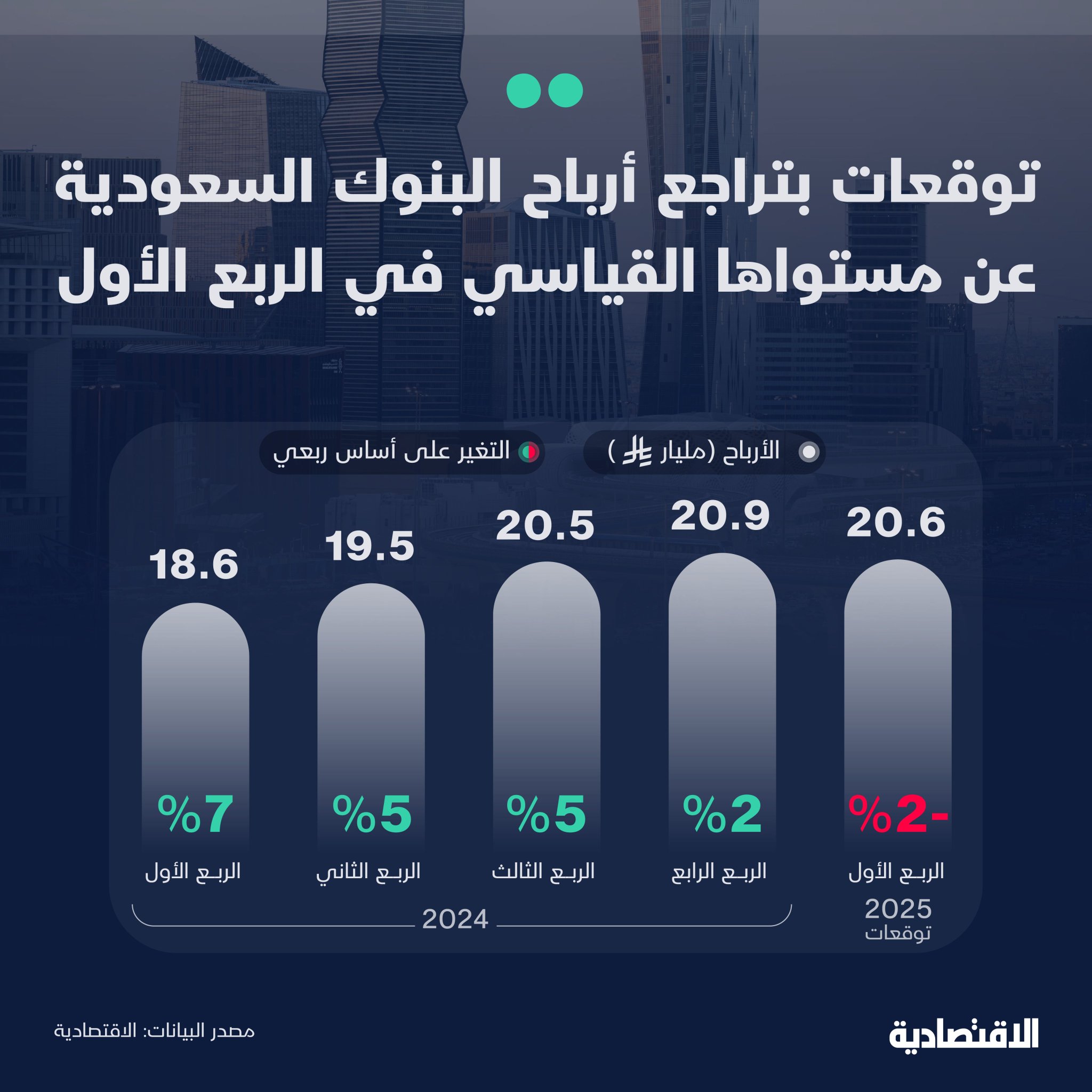 التقديرات تشير إلى أن متوسط الأرباح المتوقعة للقطاع البنكي يبلغ نحو 20.6 مليار ريال، بانخفاض 2% على أساس ربعي، في حين يتوقع أن تسجل نموا على أساس سنوي بـ11%. وفقا لوحدة التحليل المالي في "الاقتصادية"، استنادا إلى توقعات من شركات "المتحدة المالية"، "سيكو"، "الرياض المالية"، "الجزيرة كابيتال"، "قيمة"، و"الأهلي المالية".