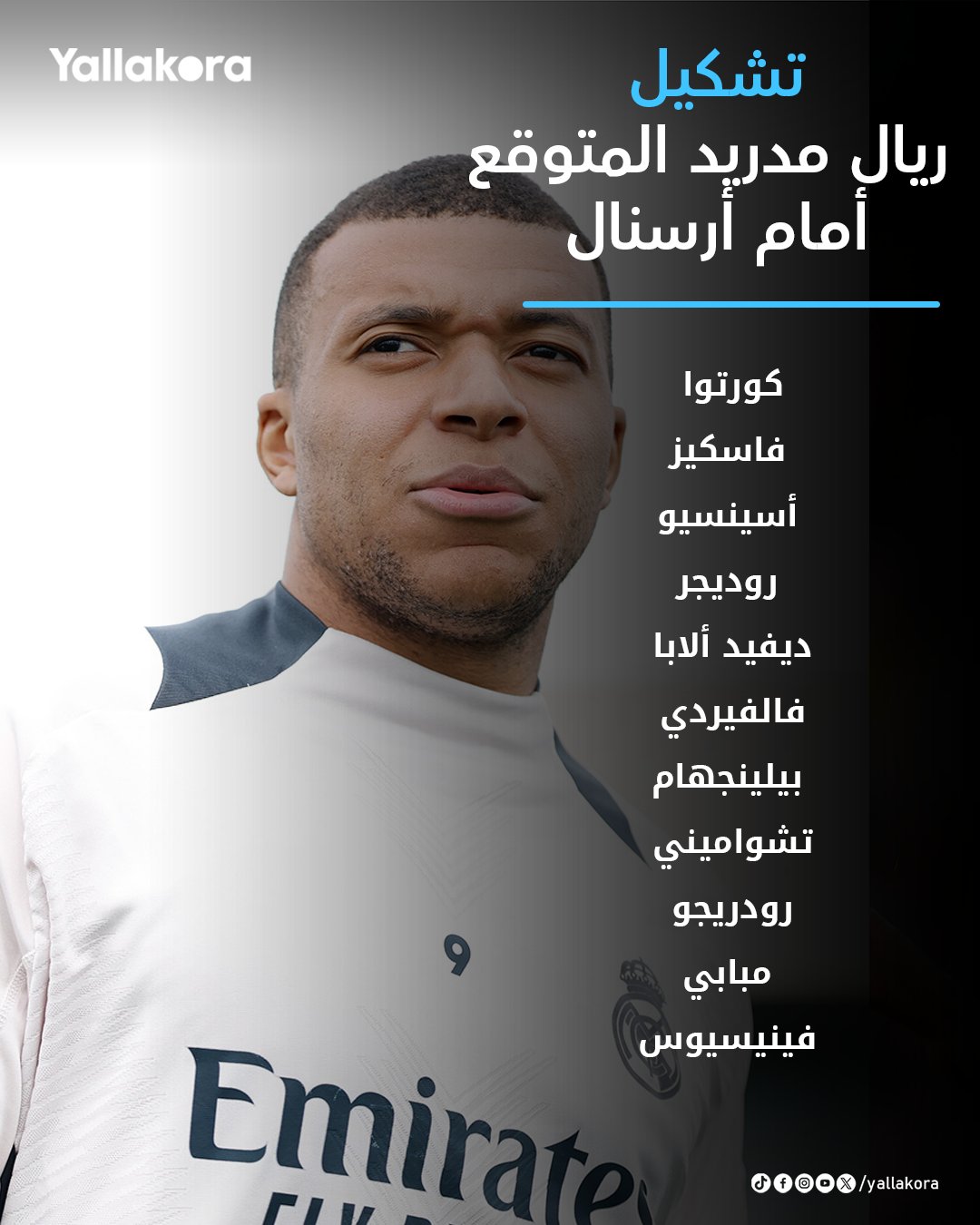 تشكيل ريال مدريد المتوقع.. مبابي يقود الثلاثي الهجومي أمام آرسنال