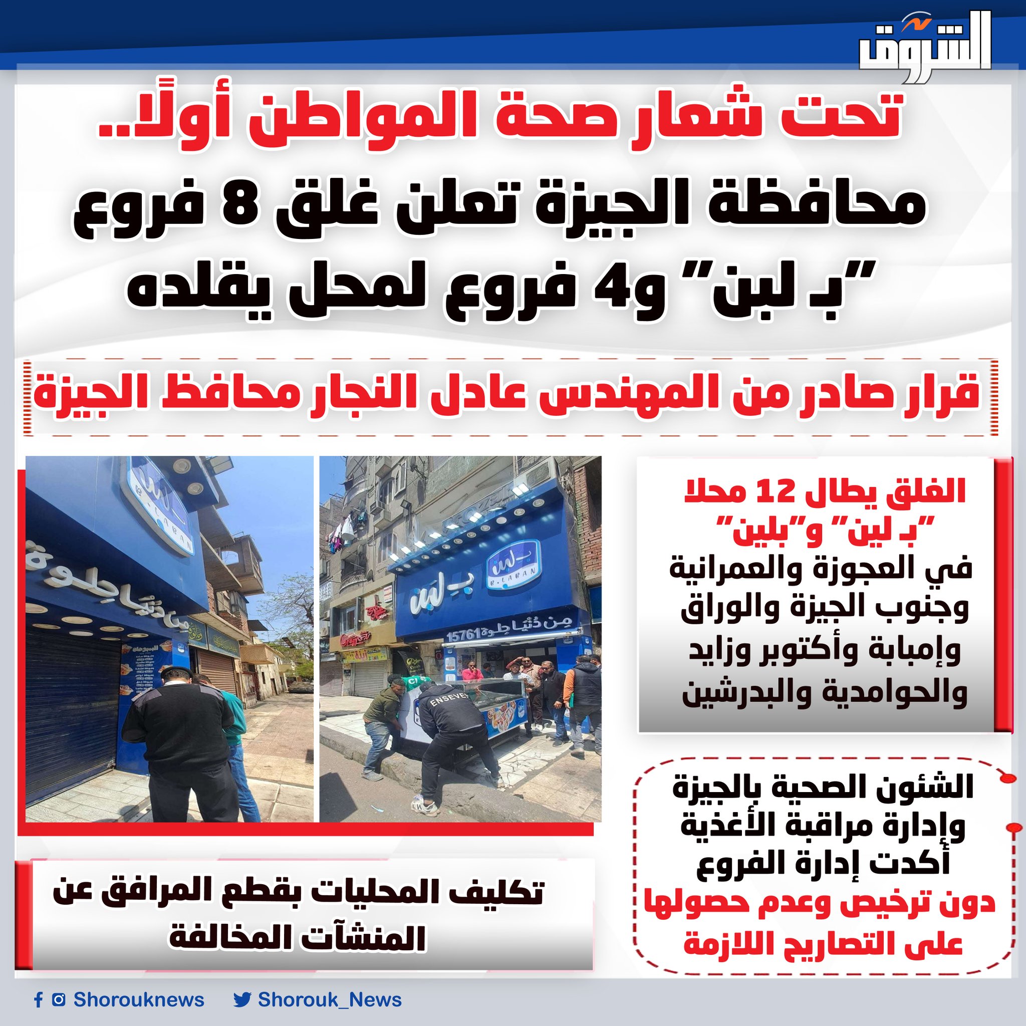 تحت شعار صحة المواطن أولًا.. محافظة الجيزة تعلن غلق 8 فروع "ب لبن" و4 فروع لمحل يقلده