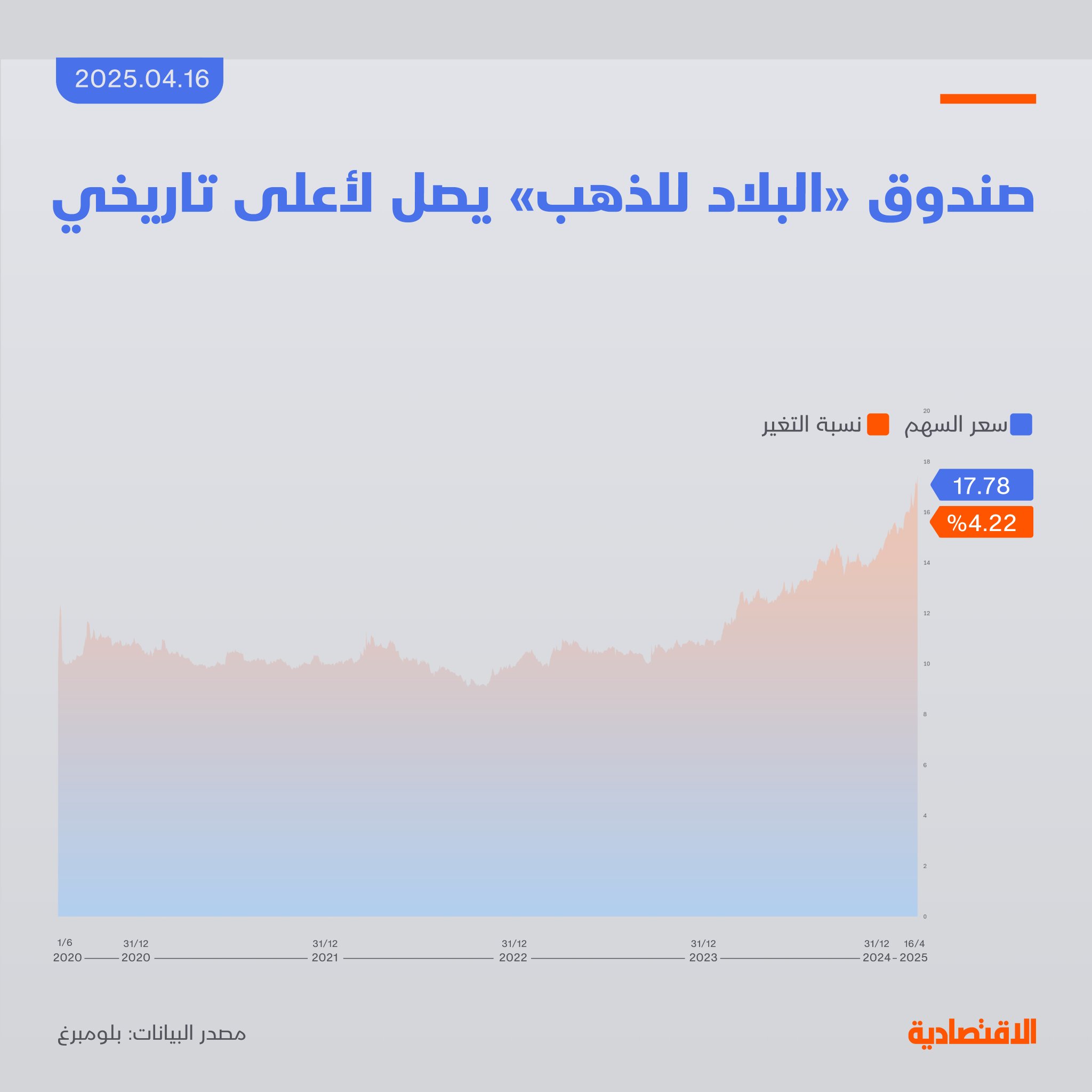 صندوق "البلاد للذهب" المتداول في تاسي يصل إلى أعلى مستوى تاريخي مرتفعا 4.2% ليصل إلى 17.78 ريال مع وصول الذهب إلى مستوى قياسي مدفوعا بتصاعد التوتر التجاري ومخاوف النمو الاقتصادي العالمي