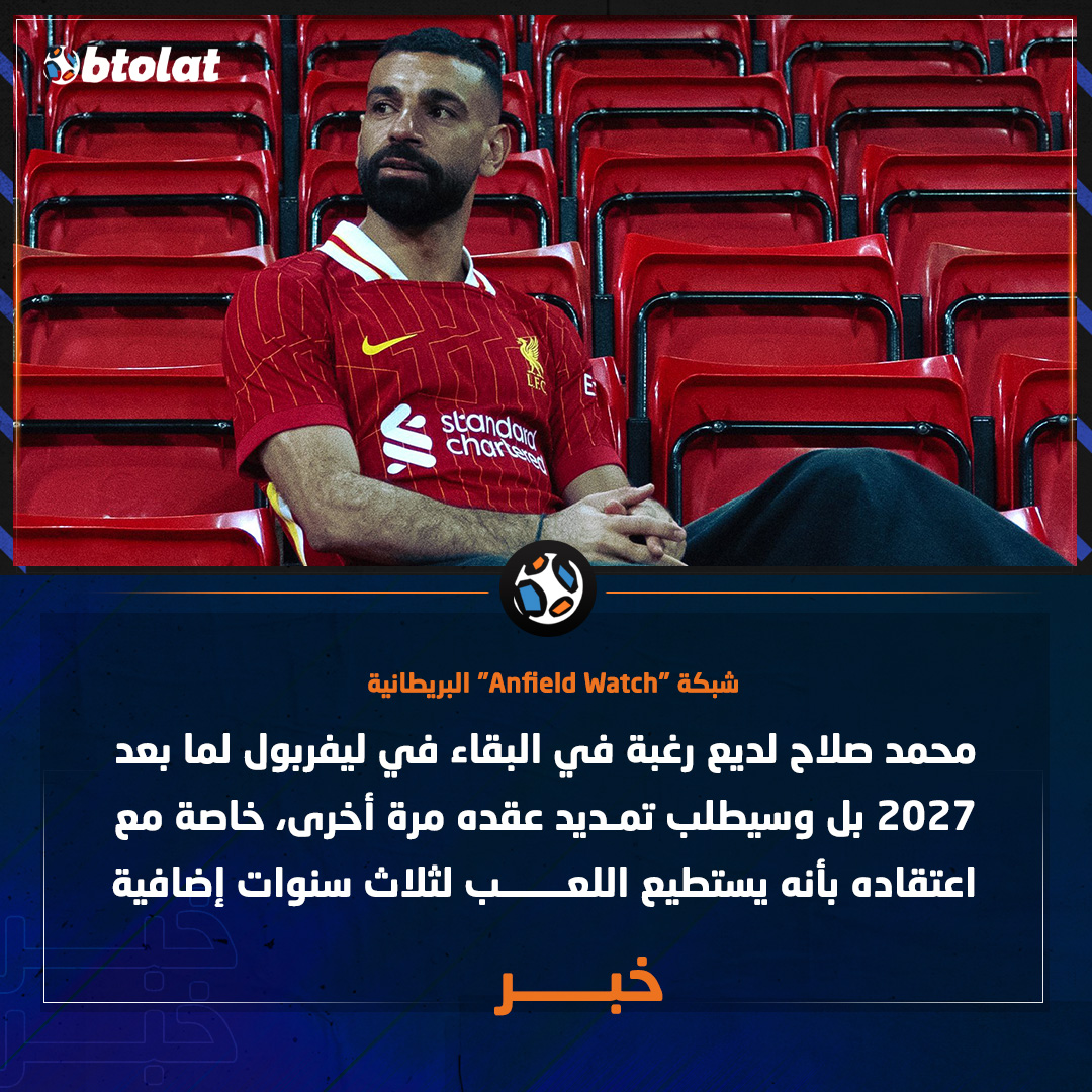 شبكة "Anfield Watch" البريطانية. "محمد صلاح لديع رغبة في البقاء في ليفربول لما بعد 2027 بل وسيطلب تمديد عقده مرة أخرى"