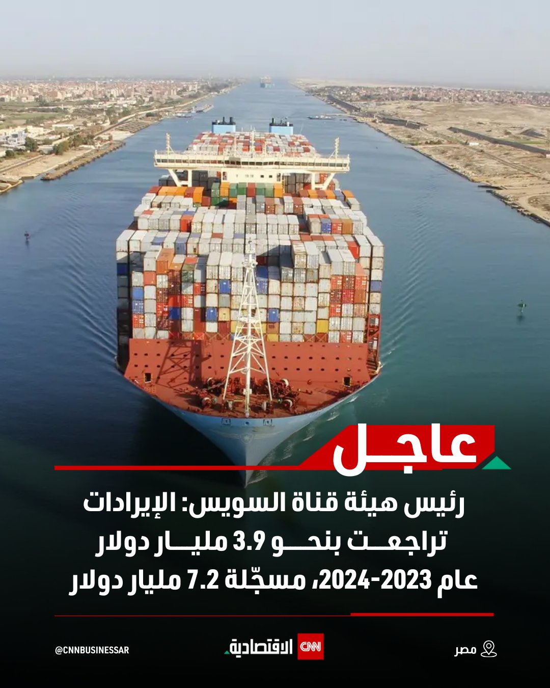 عاجل | رئيس هيئة قناة السويس: الإيرادات تراجعت بنحو 3.9 مليار دولار عام 2023-2024، مسجّلة 7.2 مليار دولار #العالم_بلغة_الأعمال