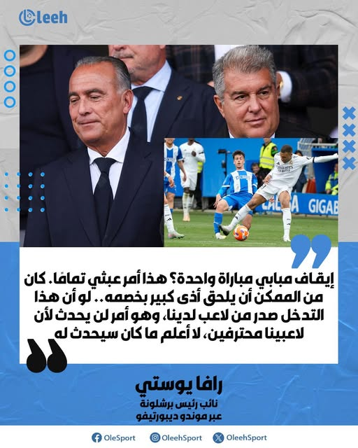 إيقاف مبابي مُباراة واحدة؟. رافا يوستي (نائب رئيس برشلونة): "إنه لأمر مُخزٍ، كان التدخل مروعًا وكان من الممكن أن يُلحق ضررًا بالغًا بخصمه، لو أن هذا التدخل صدر من لاعب في برشلونة 'وهو أمر لن يحدث لأن لاعبينا محترفين' لا أعلم ما كان سيحدث له"