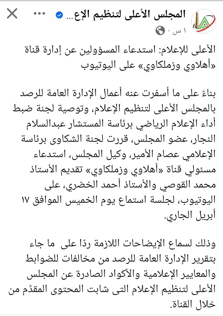 اتخذ المجلس الأعلى للإعلام قرارا رسميا حول الشكاوى التي تم تقديمها ضد مسؤولي قناة "أهلاوي وزملكاوي" عبر منصة يوتيوب، التي يقدم من خلالها الإعلاميان الرياضيان محمد القوصي وأحمد الخضري، تحليلا للأحداث الكروية المصرية.