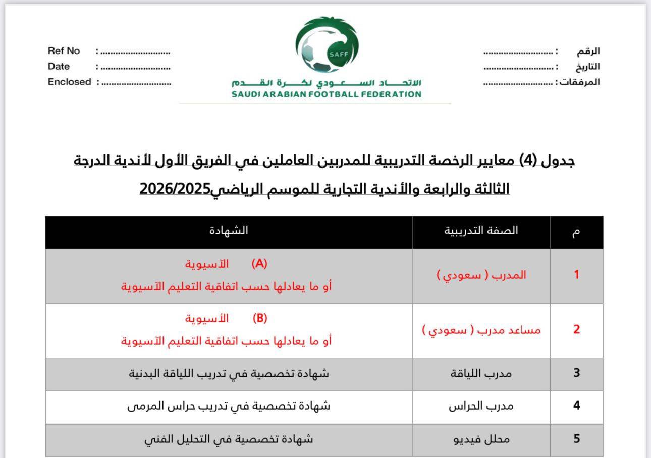 إلزام أندية الدرجتين الثالثة والرابعة بتعيين مدرب سعودي اعتبارًا من موسم 2025 2026 (الشرق الأوسط)