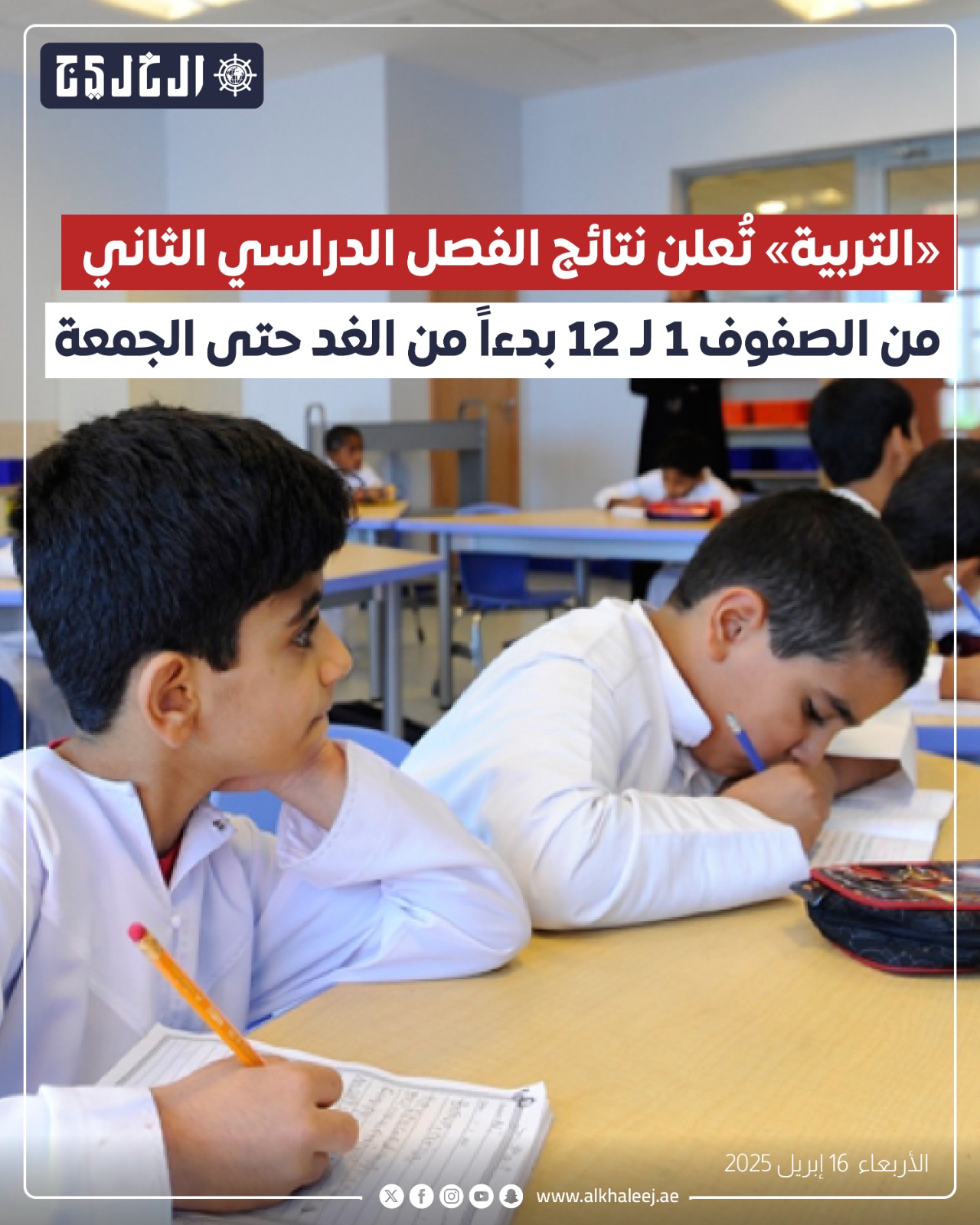 وبحسب الجدول المعلن، تبدأ عملية إعلان النتائج الأربعاء، وتشمل الصفوف من الأول حتى الرابع، على أن تتابع الوزارة يوم الخميس إعلان نتائج الصفوف من الخامس حتى الثامن، فيما تُستكمل النتائج يوم الجمعة بإعلان نتائج الصفوف من التاسع حتى الثاني عشر. وذكرت الوزارة أن النتائج متاحة اعتباراً من الساعة العاشرة صباحاً في كل يوم من الأيام المذكورة.