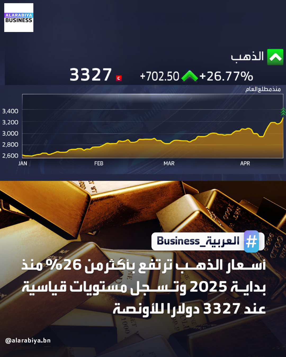 أسعار الذهب ترتفع بأكثر من 26% منذ بداية عام 2025 وتسجل مستويات قياسية عند 3327 دولارا للأونصة _Business