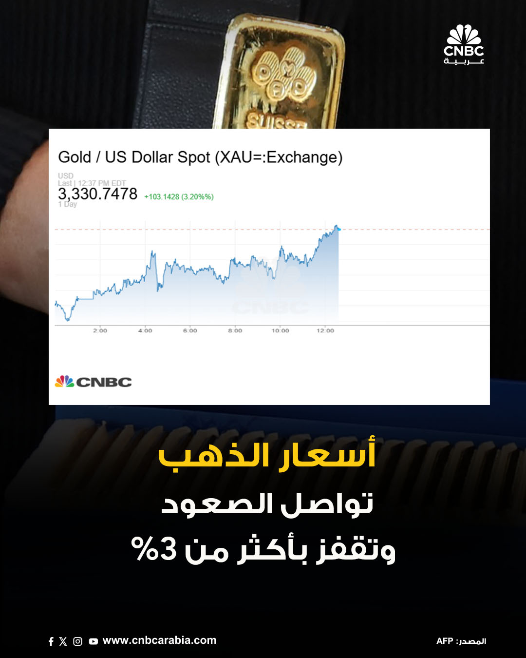 أسعار الذهب في المعاملات الفورية تقفز بأكثر من 100 دولار للأونصة أو بنسبة 3.2% خلال تعاملات الأربعاء بعد تجاوزها مستوى 3300 دولار لأول مرة في تاريخها خلال وقت سابق من التعاملات #عاجل