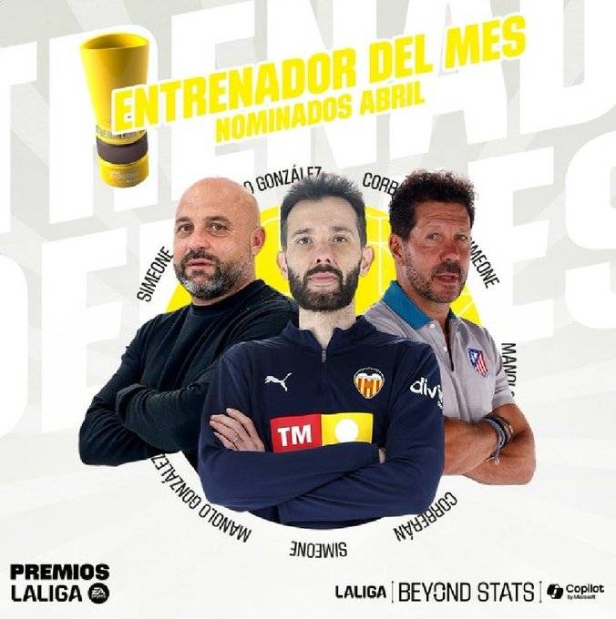 المُدربين المُرشحين لجائزة أفضل مُدرب في الليغا عن شهر أبريل.. دييغو سيميوني ( أتلتيكو مدريد ). مانولو غونزاليز ( إسبانيول ). كارلوس كوربيران ( فالنسيا )