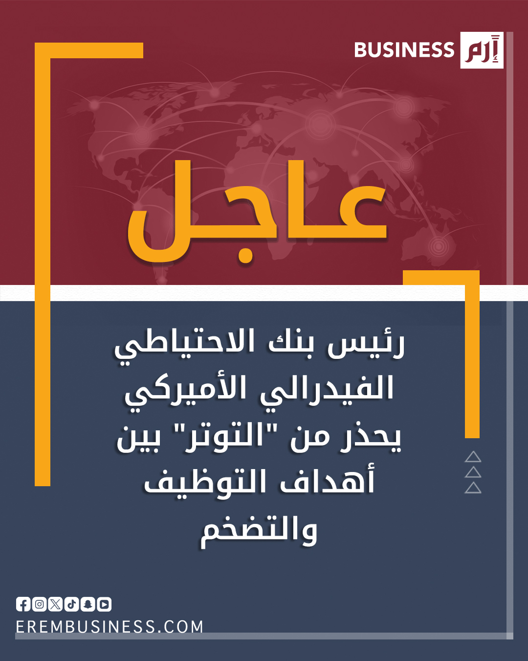 عاجل رئيس بنك الاحتياطي الفيدرالي الأمريكي يحذر من "التوتر" بين أهداف التوظيف والتضخم