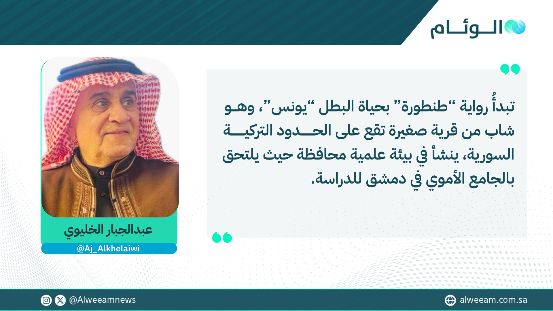 تبدأُ رواية طنطورة بحياة البطل يونس ، وهو شاب من قرية صغيرة تقع على الحدود التركية السورية، ينشأ في بيئة علمية محافظة حيث يلتحق بالجامع الأموي في دمشق للدراسة.