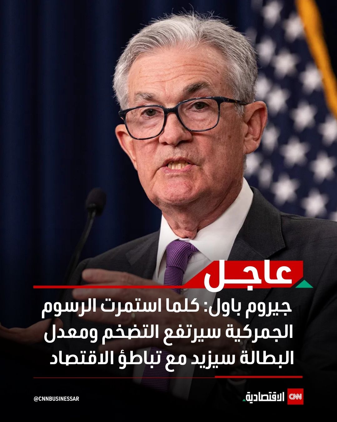 عاجل | جيروم باول: كلما استمرت الرسوم الجمركية سيرتفع التضخم ومعدل البطالة سيزيد مع تباطؤ الاقتصاد #العالم_بلغة_الأعمال
