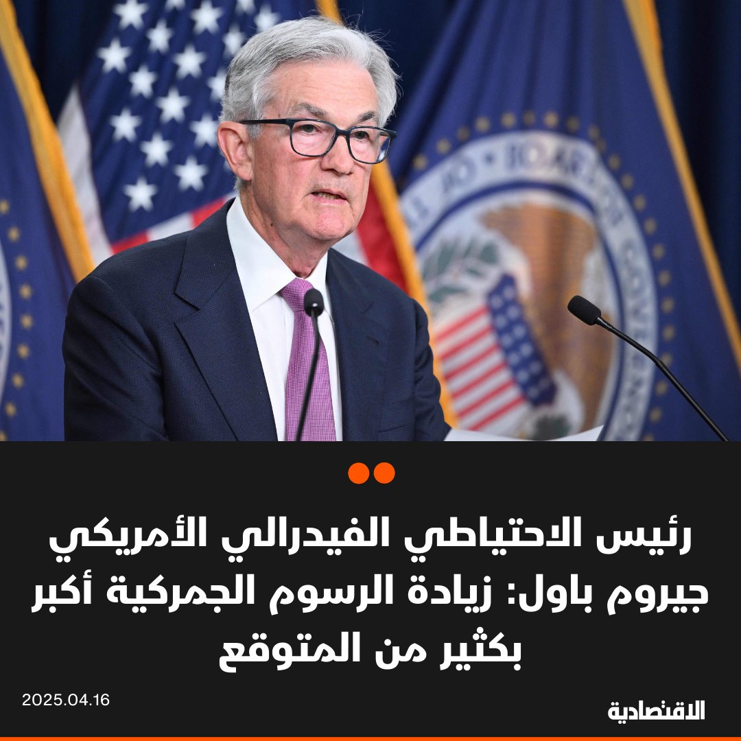عاجل | رئيس الاحتياطي الفيدرالي الأمريكي جيروم باول: - الرسوم الجمركية التي فرضها ترمب فاقت توقعاتنا - إدارة ترمب تقوم بإجراءات اقتصادية كثيرة لا يمكن التنبؤ بنتائجها وقد تبعدنا عن أهدافنا - الرسوم ستؤدي إلى ارتفاع مؤقت في مستويات التضخم - أتوقع ارتفاع أسعار نفقات الاستهلاك الشخصي 2.3%