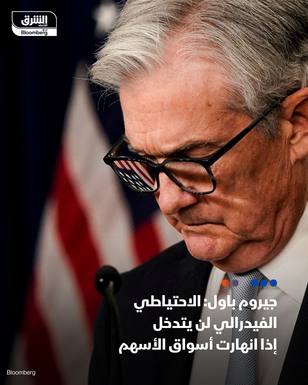 جيروم باول، رئيس مجلس الاحتياطي الفيدرالي: - الاحتياطي الفيدرالي لن يتدخل إذا انهارت أسواق الأسهم - تقلبات أسواق الأسهم والسندات تعكس حالة عدم اليقين التي نمر بها حالياً. #عاجل