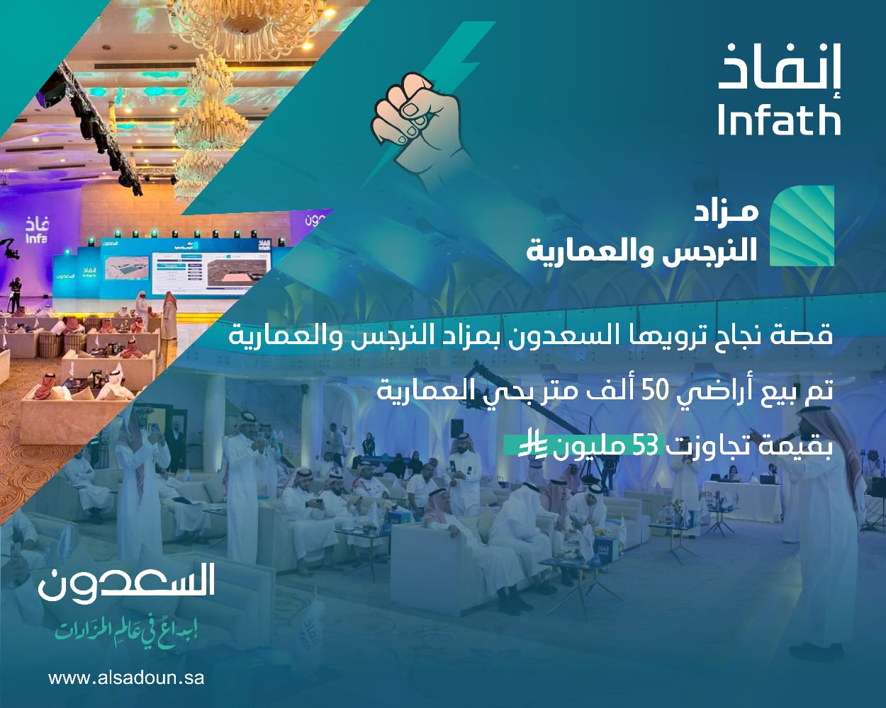 وسط حضور كثيف من رجال الأعمال والمستثمرين... أعلنت شركة السعدون العقارية نجاح مزاد النرجس والعمارية في بيع أراضٍ تجاوزت مساحتها 50,000 متر مربع